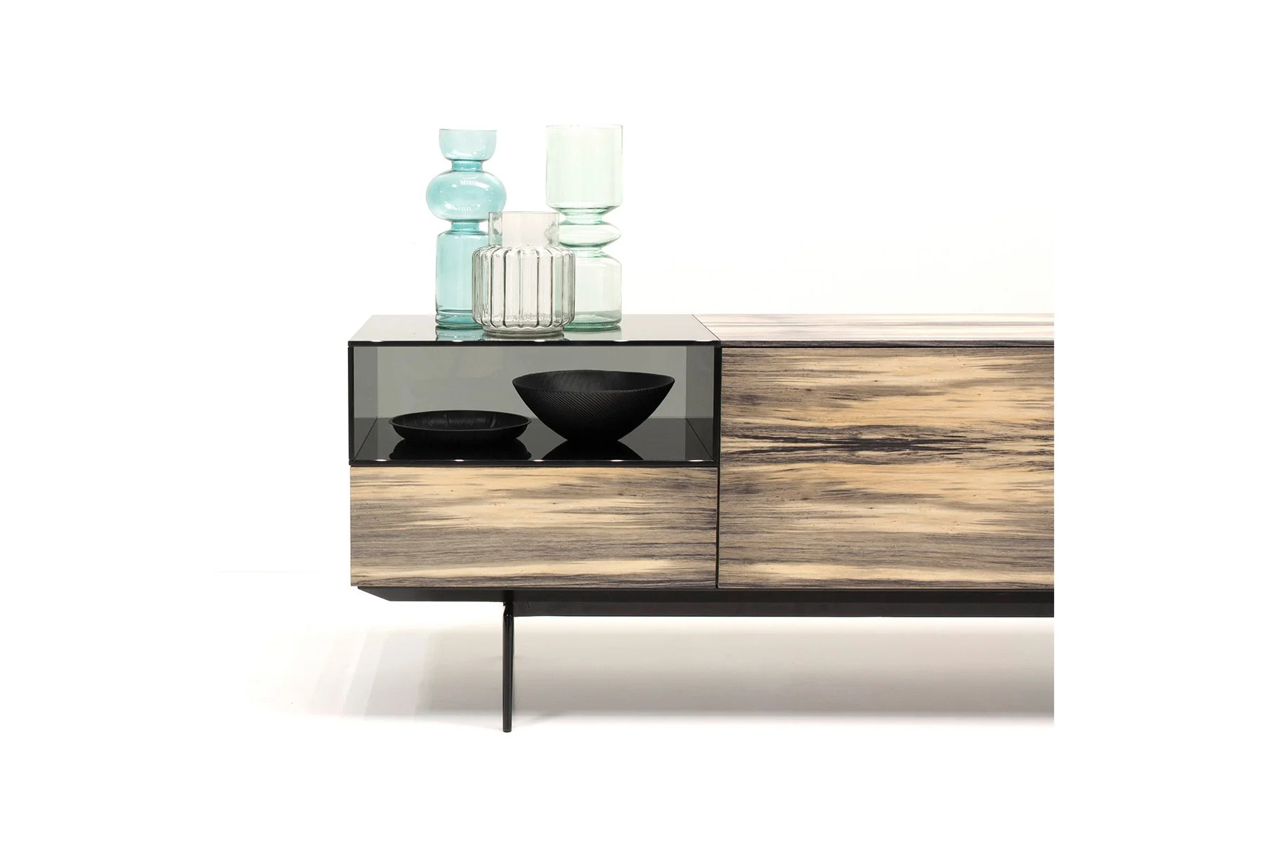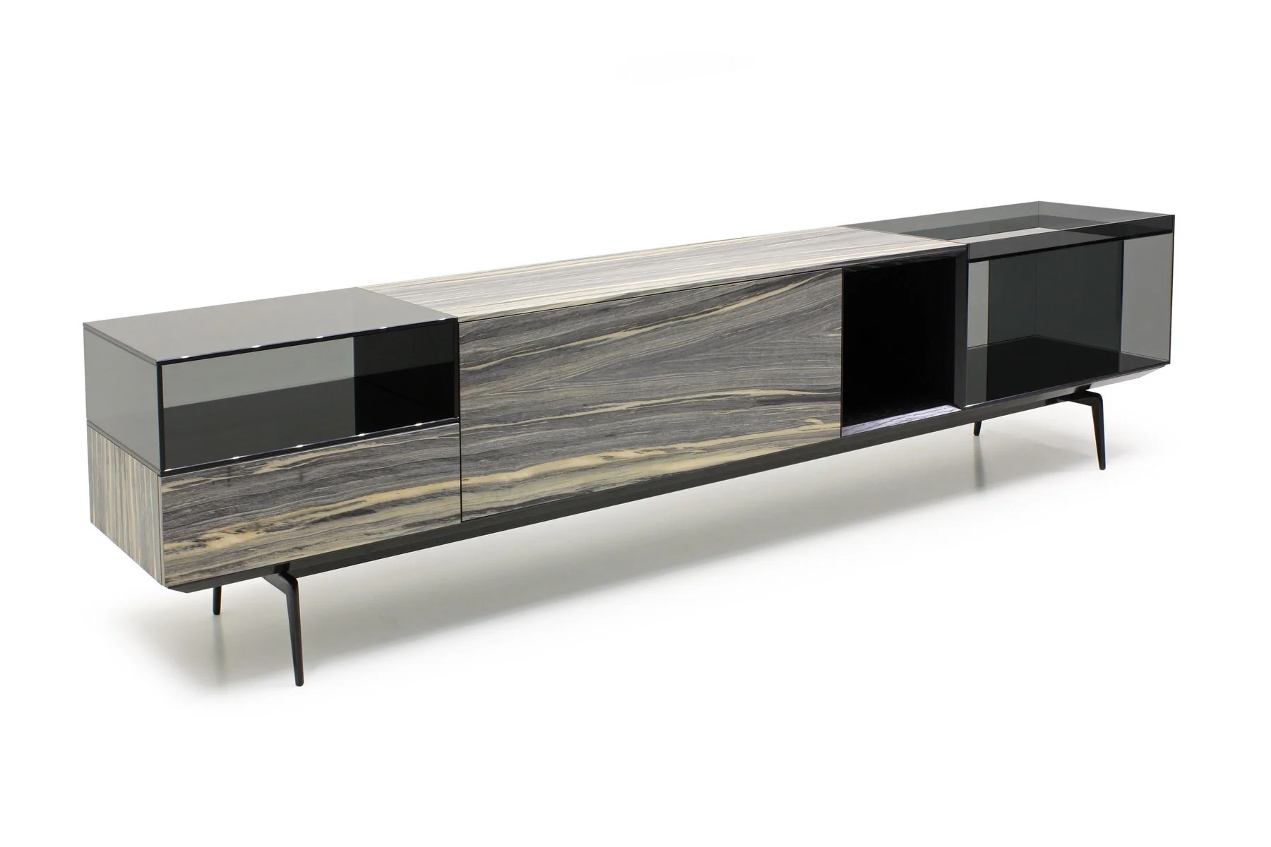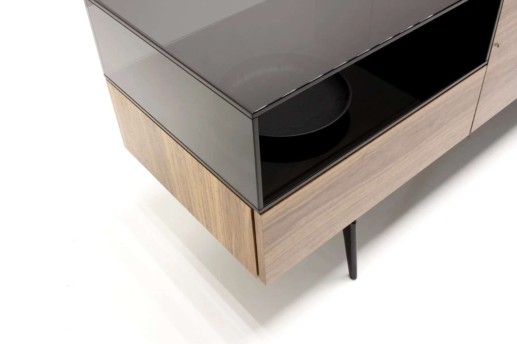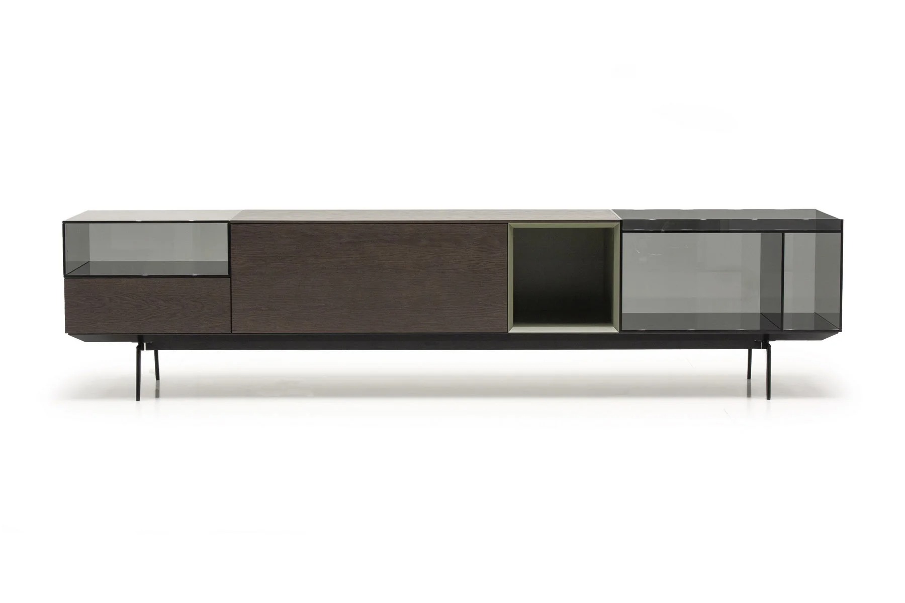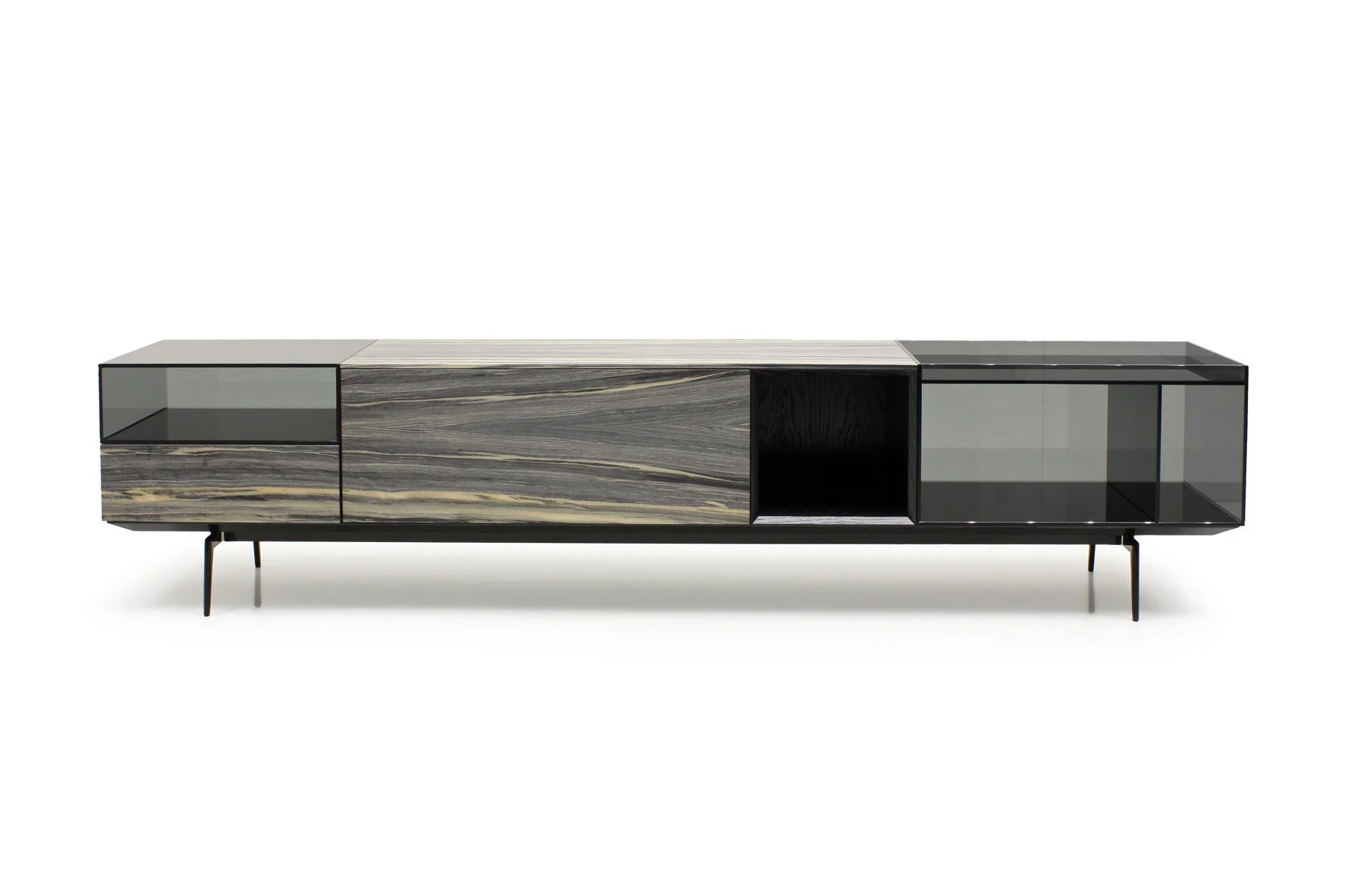 Тумба для TV Lugano – это необычное сочетание форм и фактур. Она выполнена из стекла, дерева и алюминия.