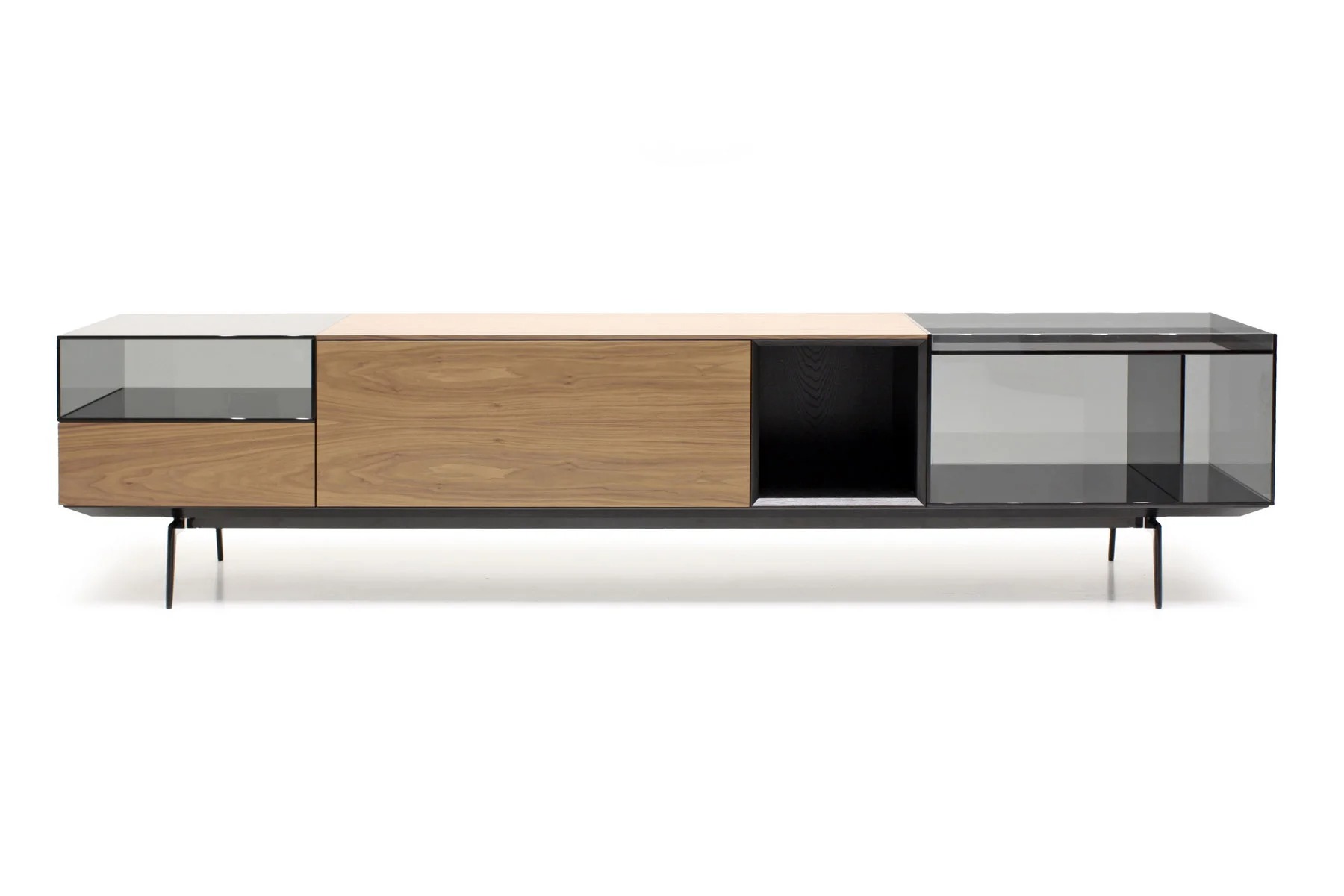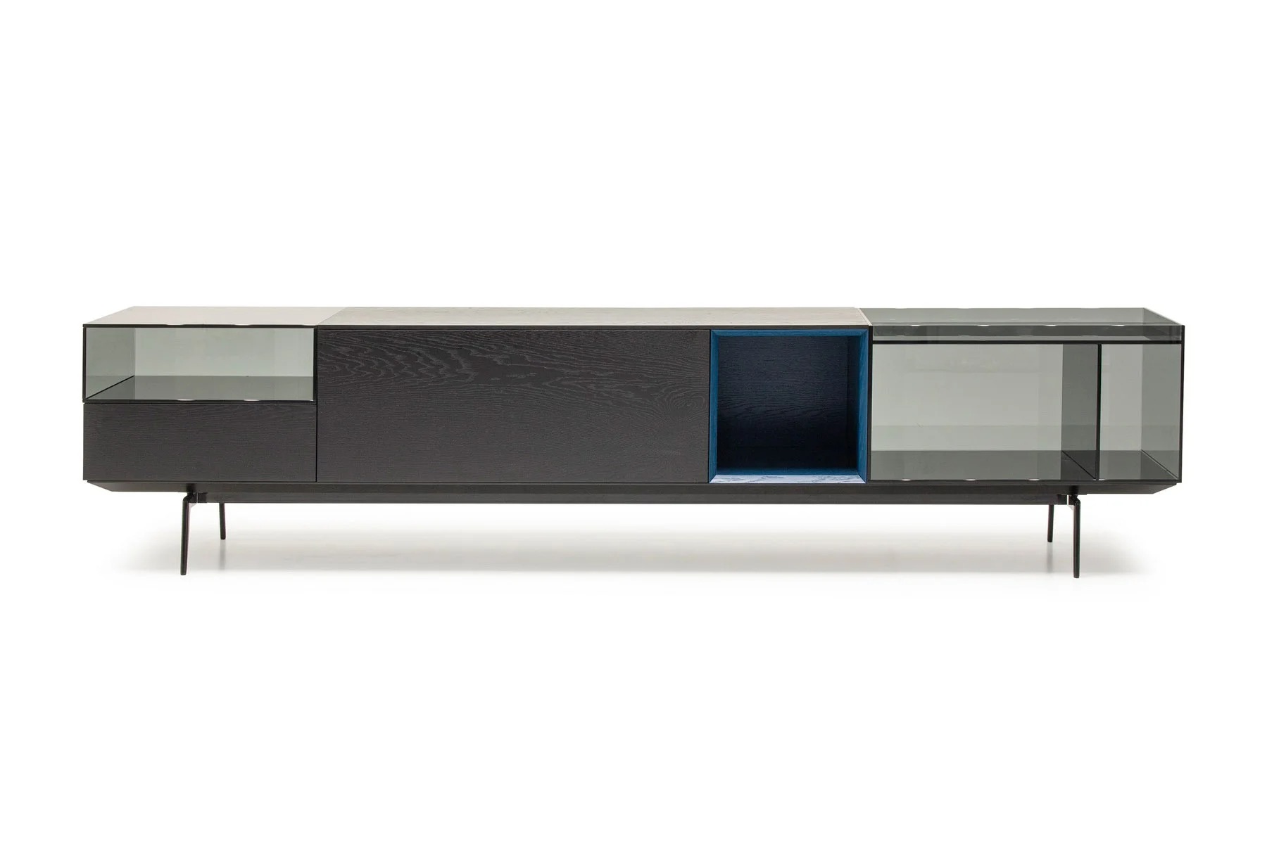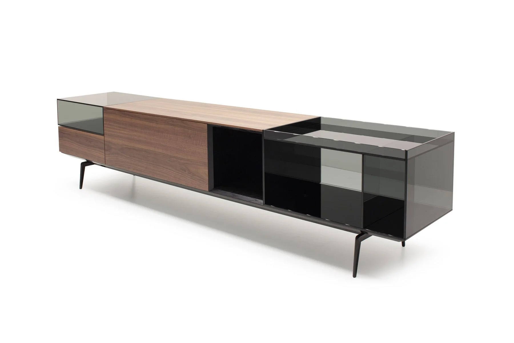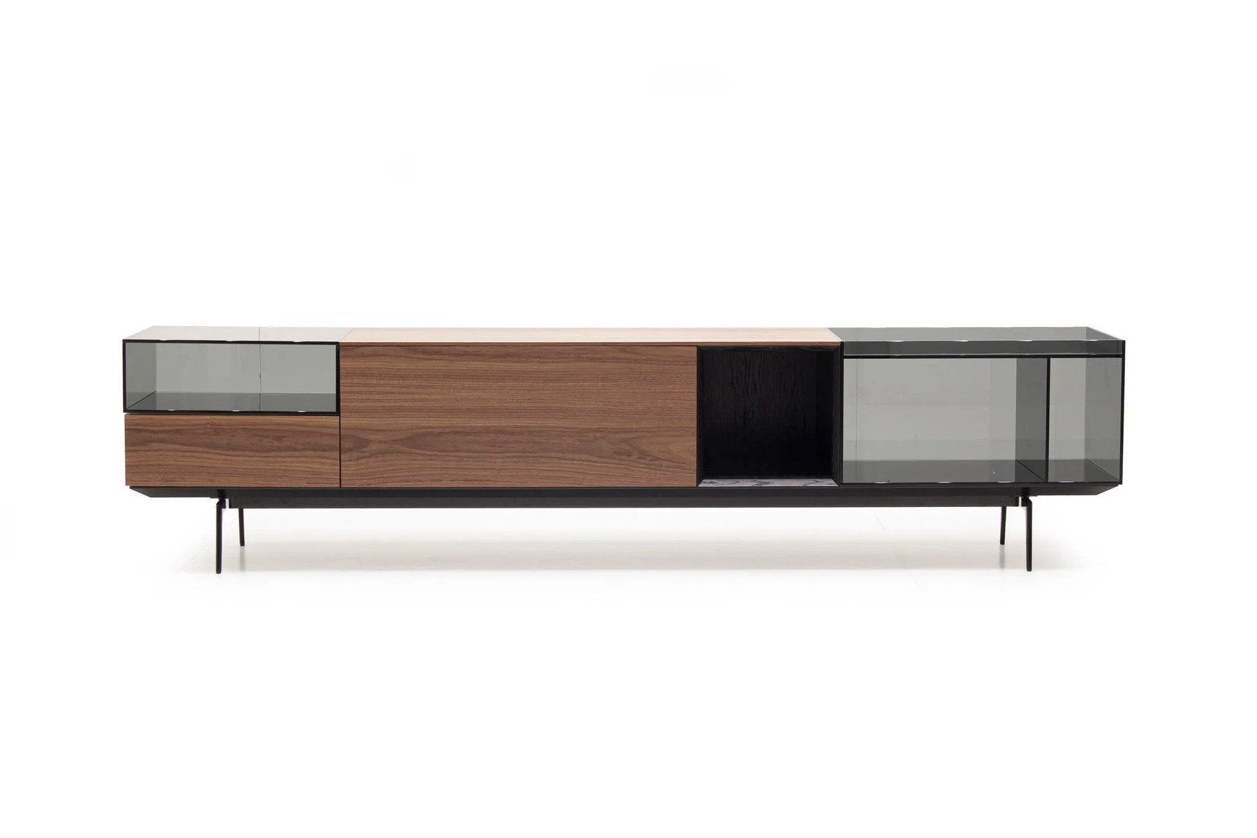 Тумба для TV Lugano – это необычное сочетание форм и фактур. Она выполнена из стекла, дерева и алюминия.