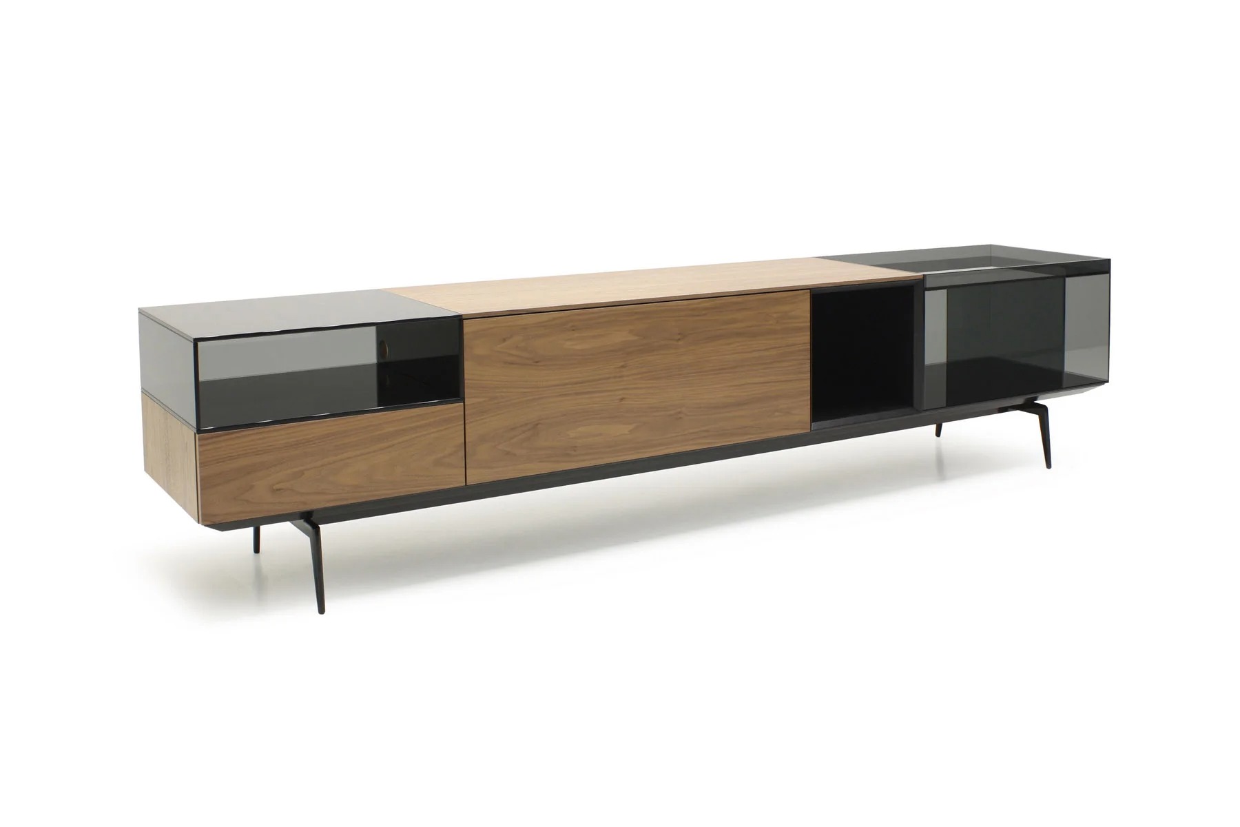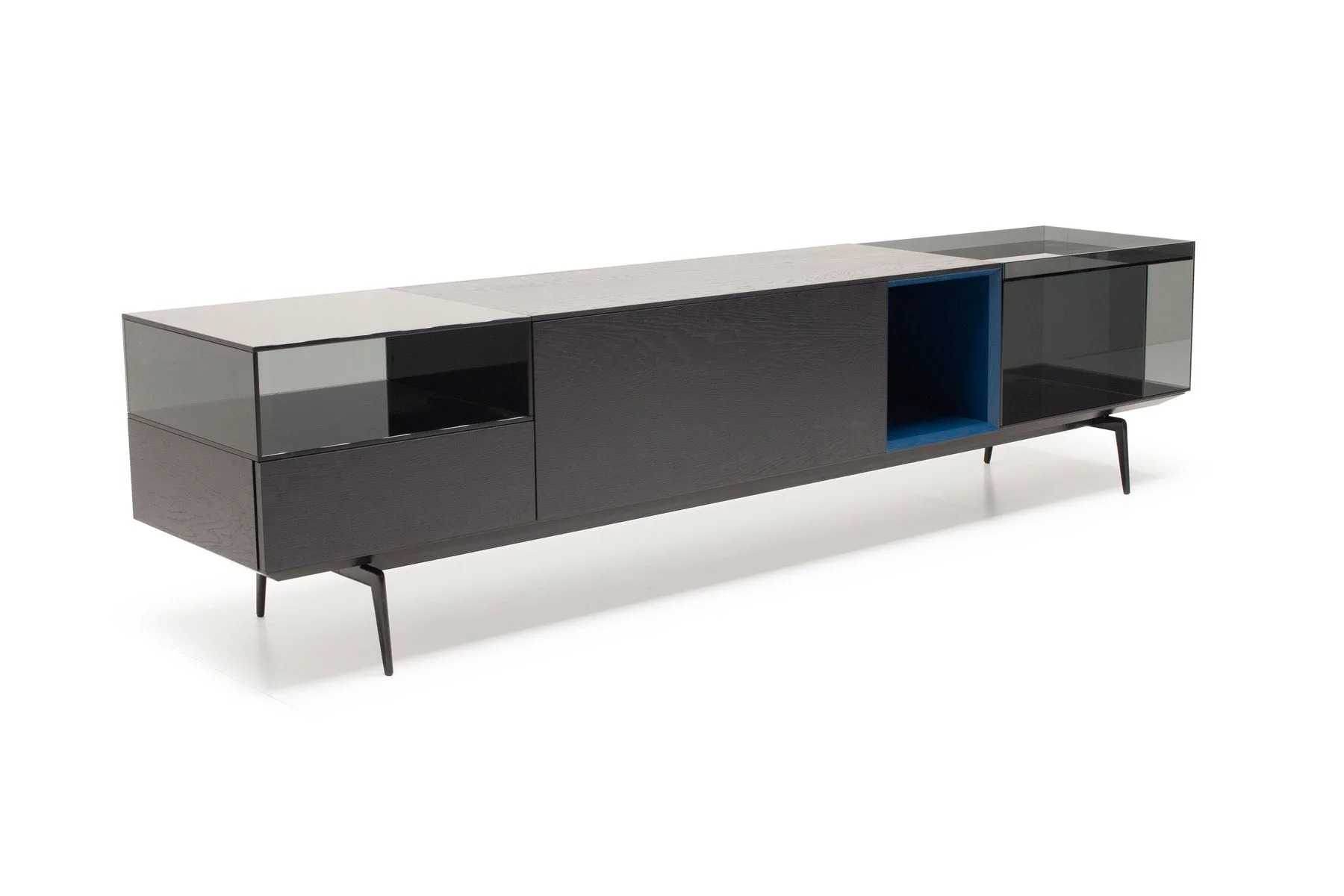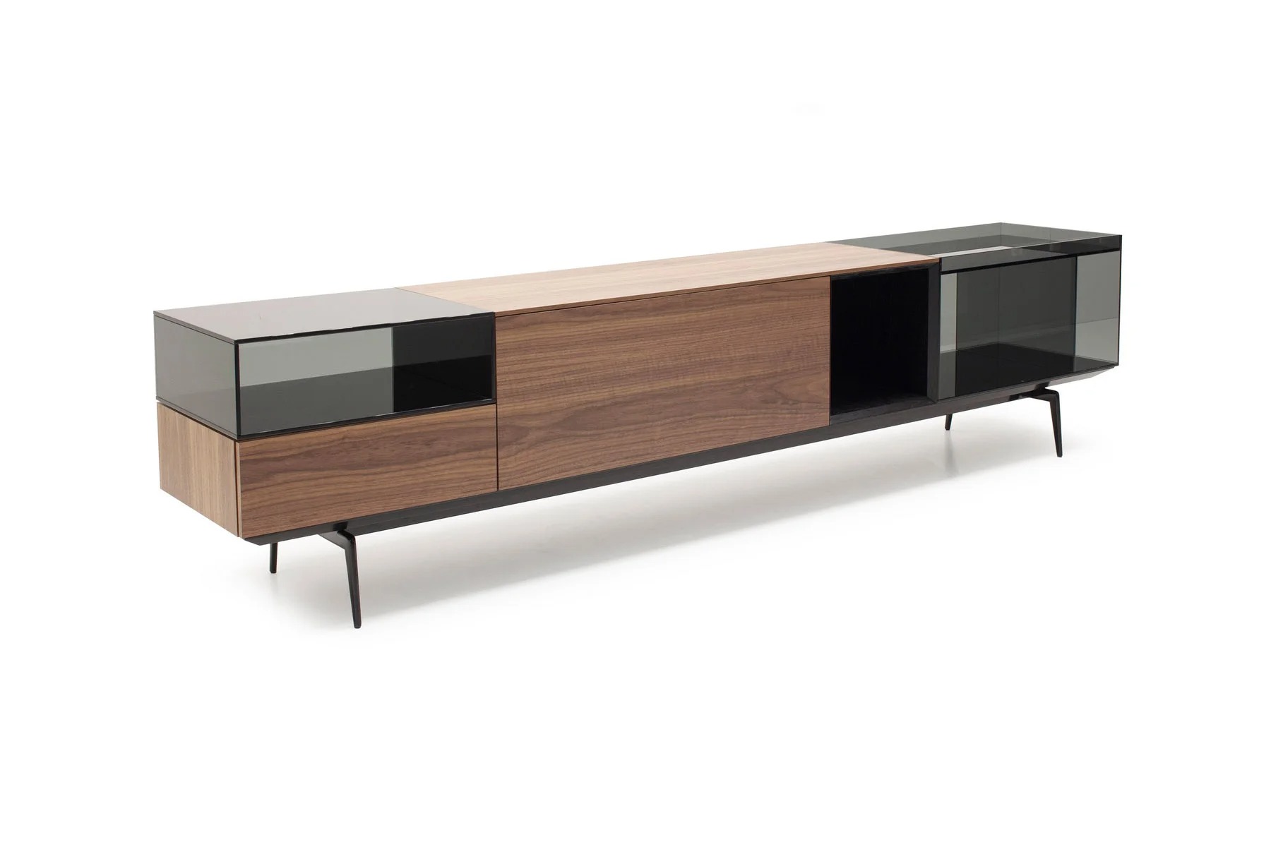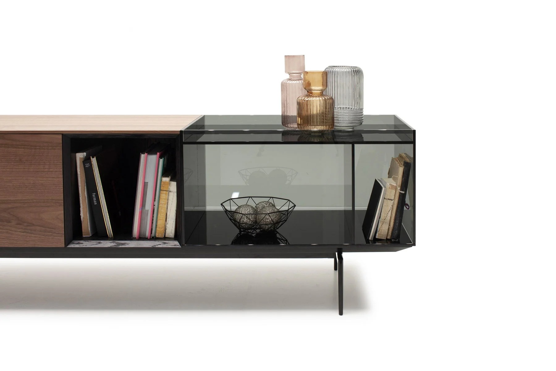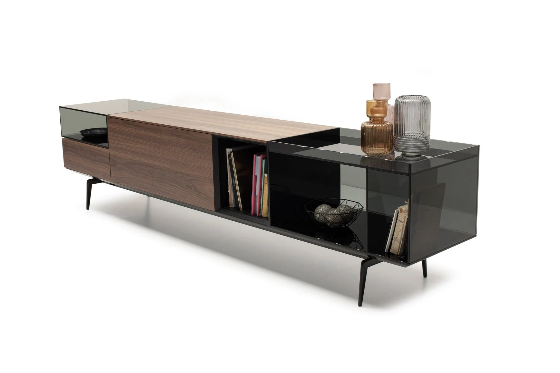 Тумба для TV Lugano – это необычное сочетание форм и фактур. Она выполнена из стекла, дерева и алюминия.