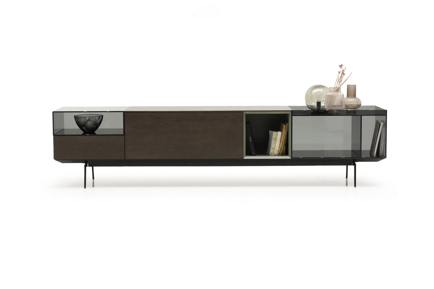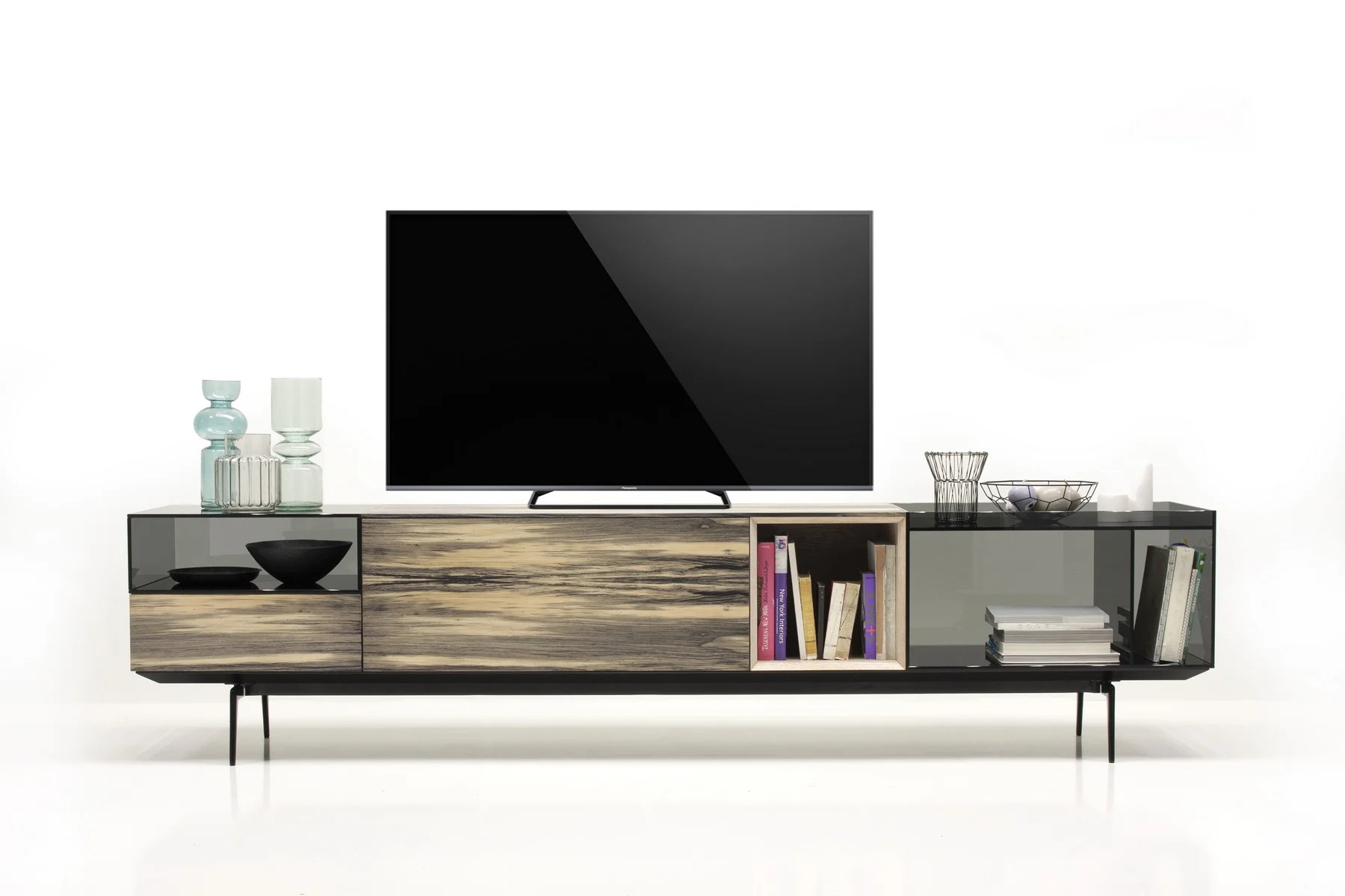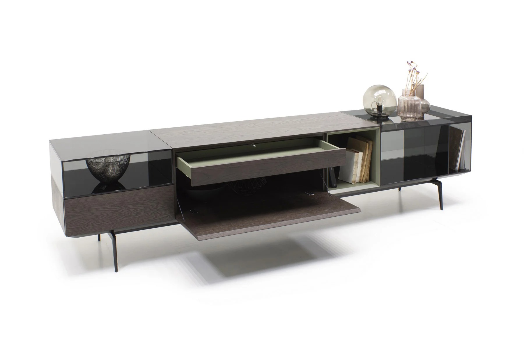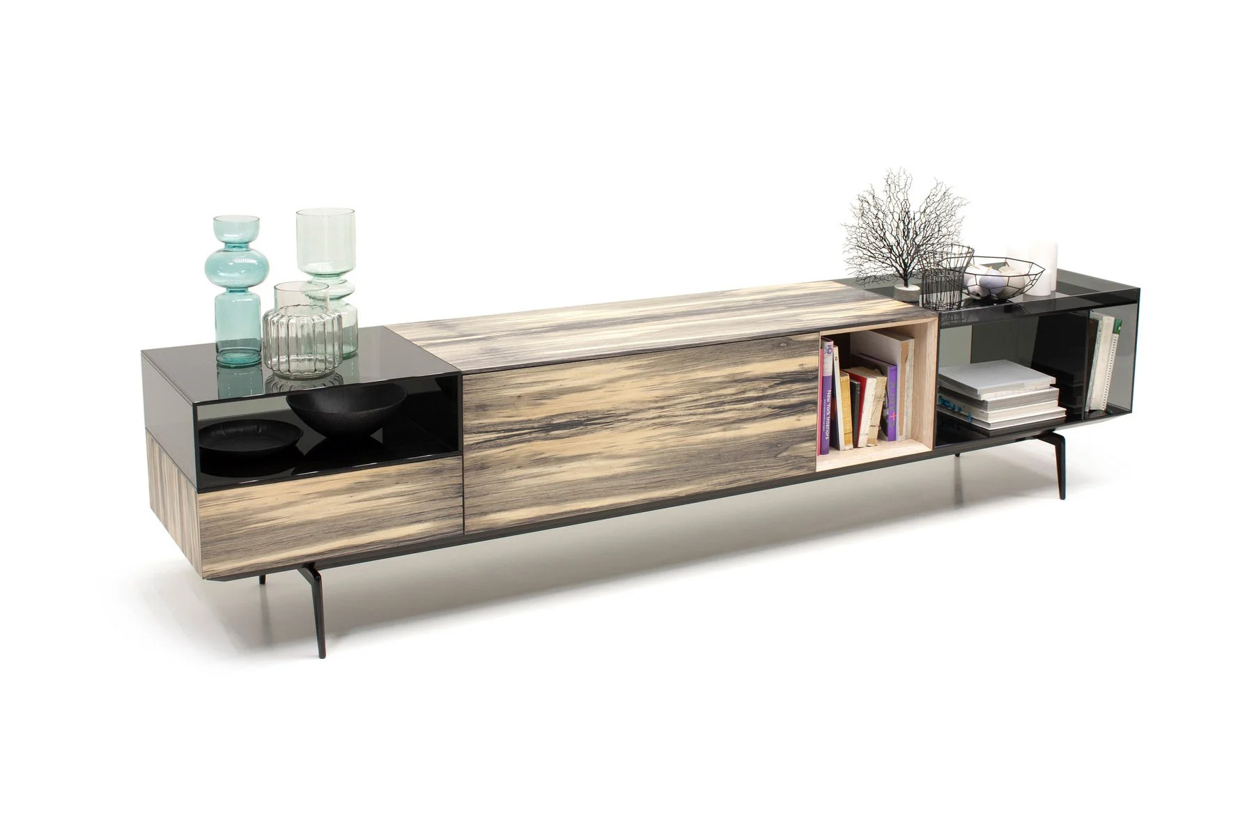 Тумба для TV Lugano – это необычное сочетание форм и фактур. Она выполнена из стекла, дерева и алюминия.