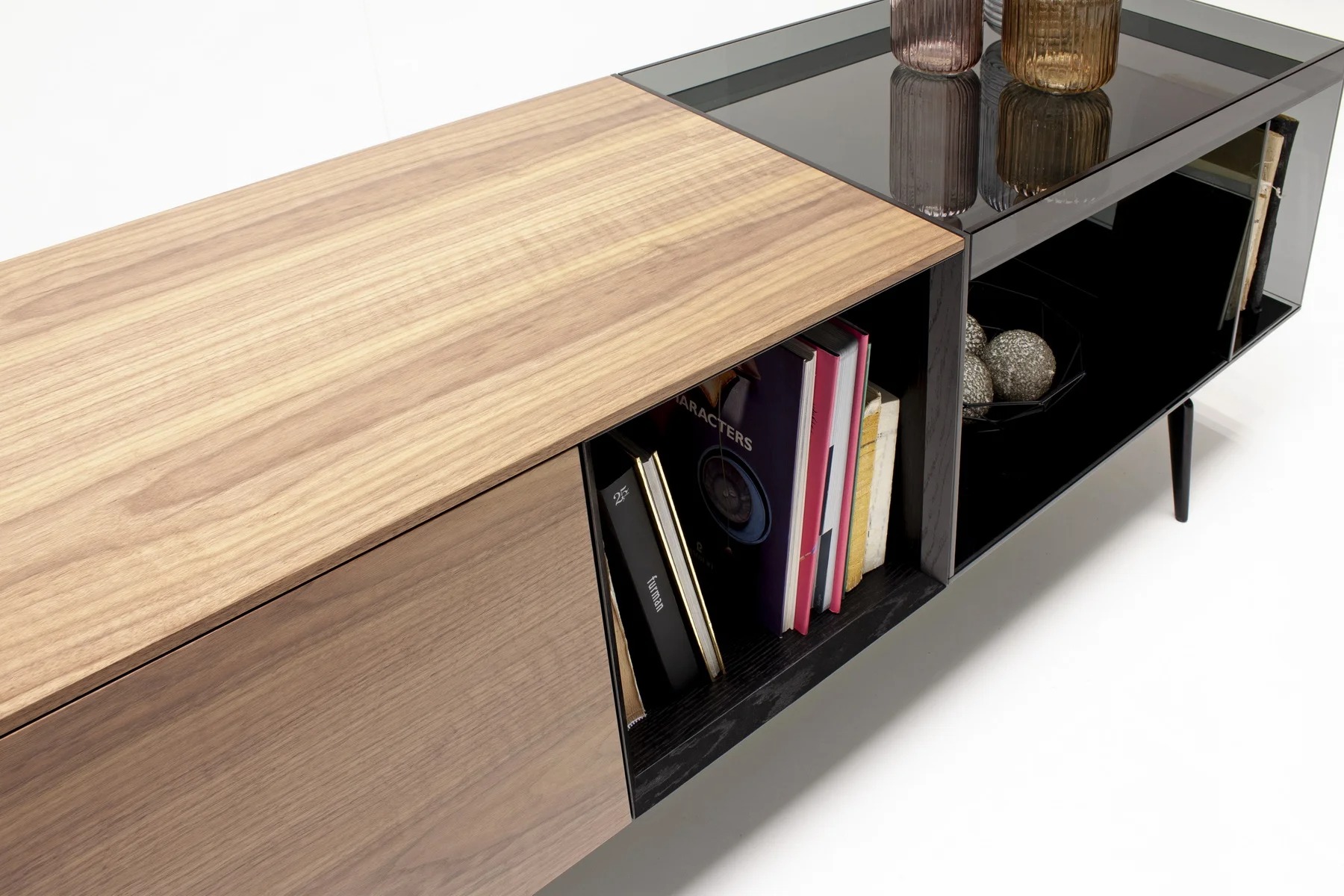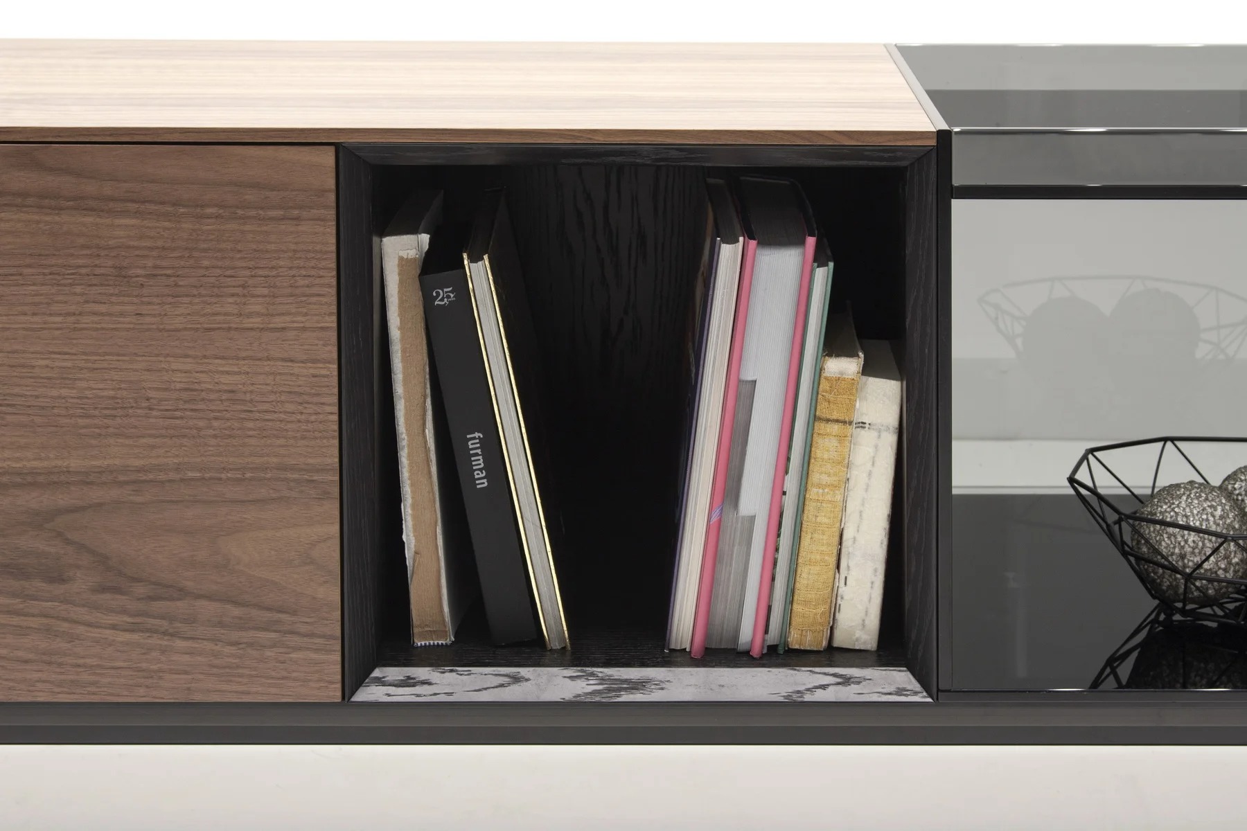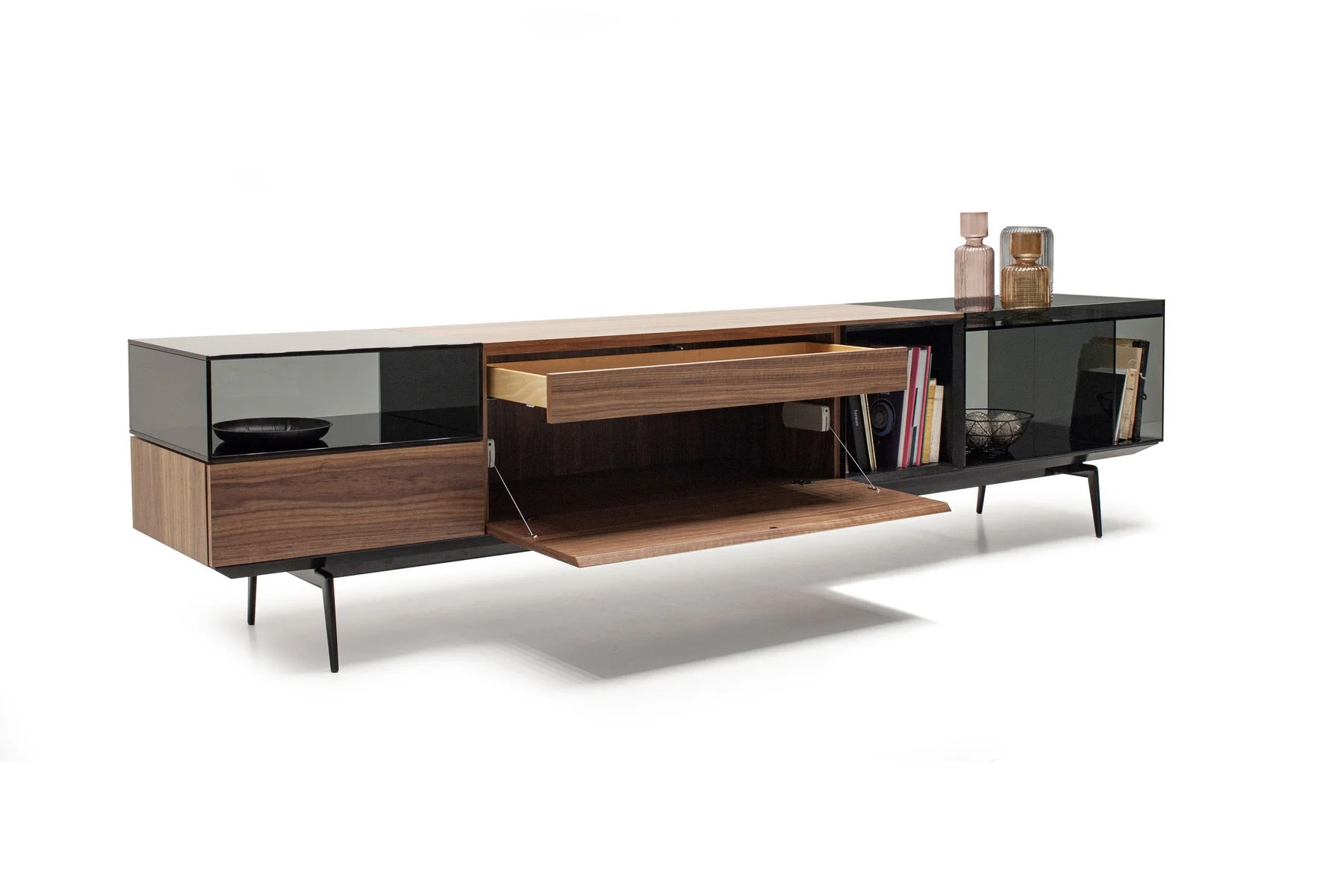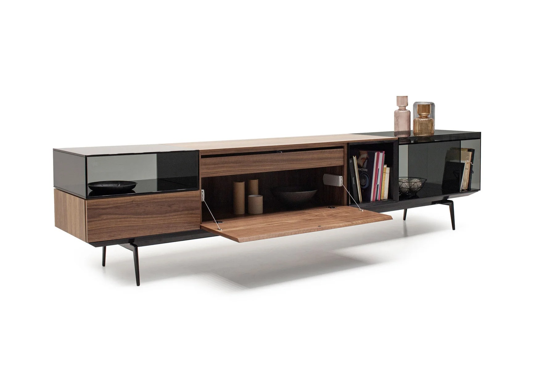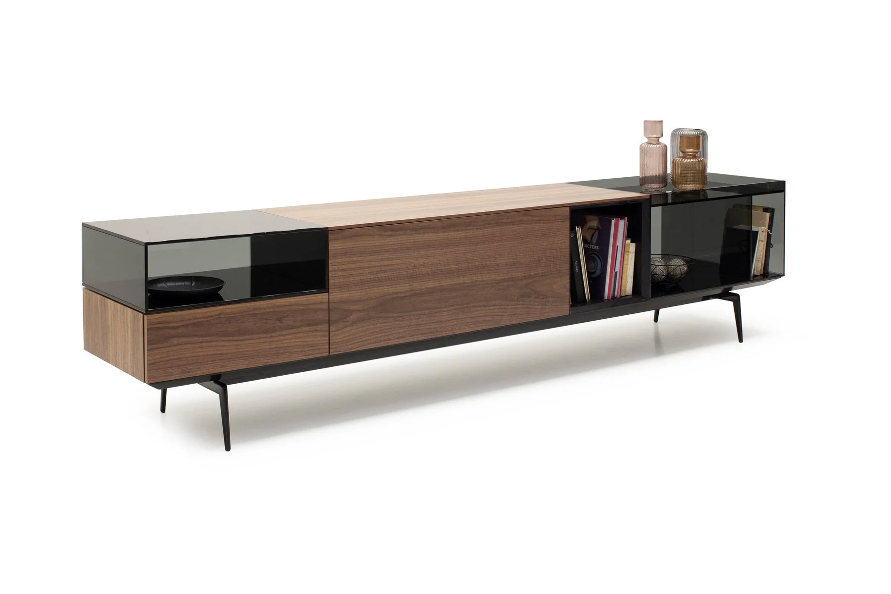 Тумба для TV Lugano – это необычное сочетание форм и фактур. Она выполнена из стекла, дерева и алюминия.