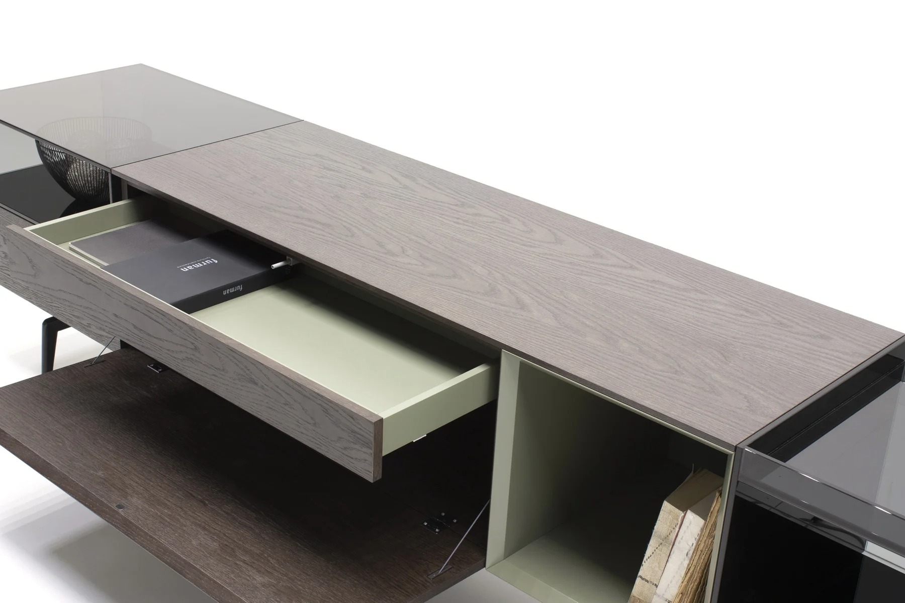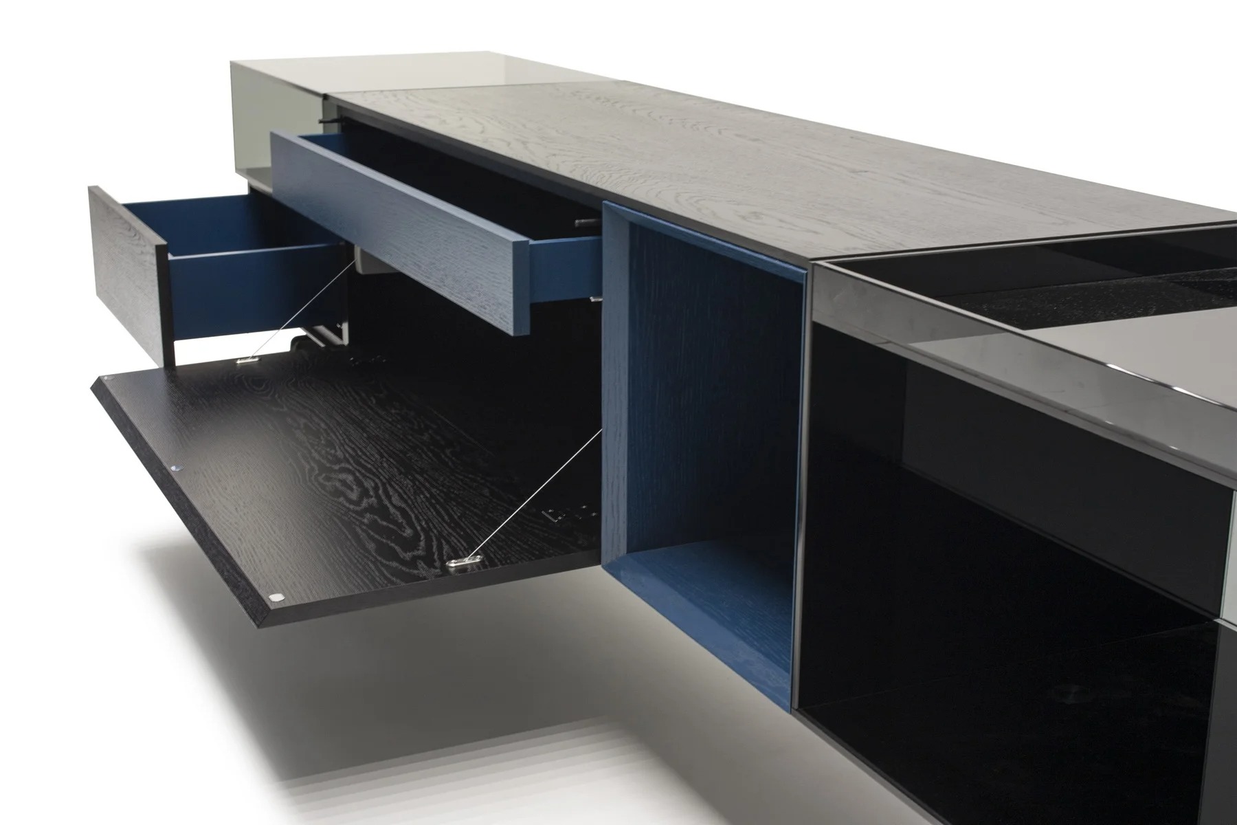 За откидной дверцей, спрятан выдвижной ящик. Дверца открывается вниз лёгким нажатием.