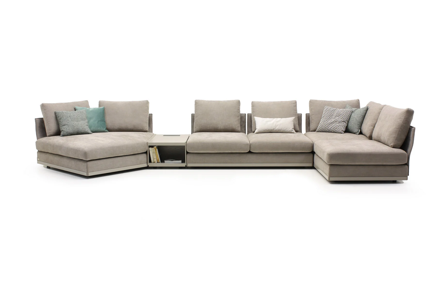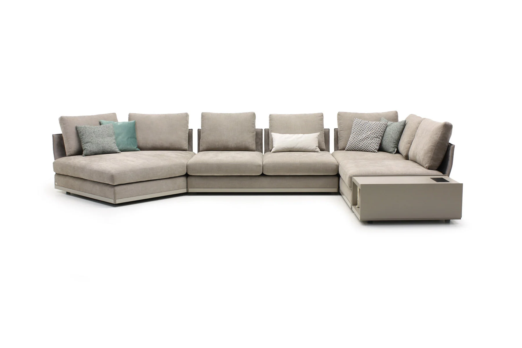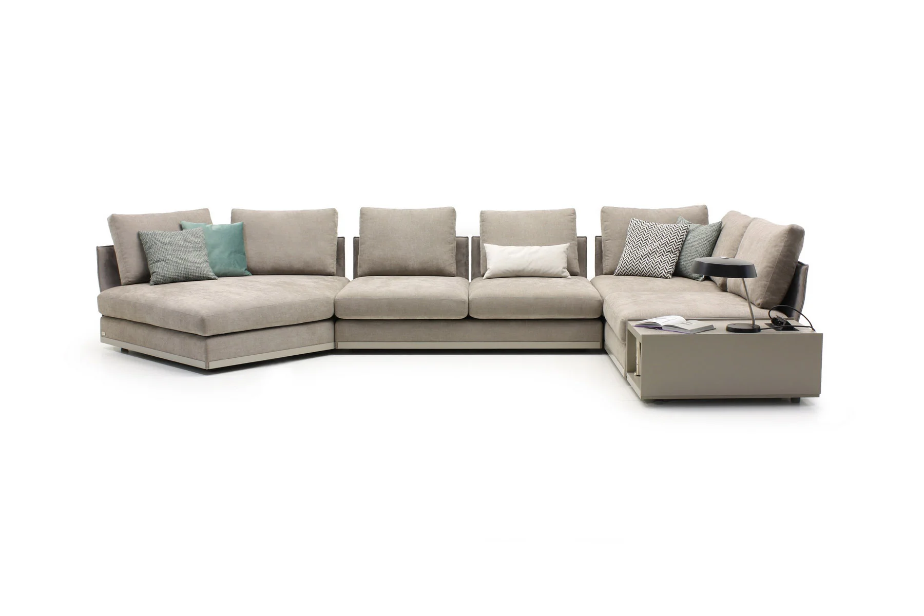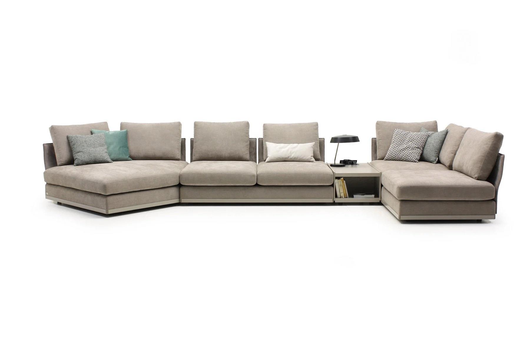 Модули дивана возможны в разных размерах, благодаря чему, Aston имеет много композиционных решений. По желанию его можно разнообразить модулем с полкой.