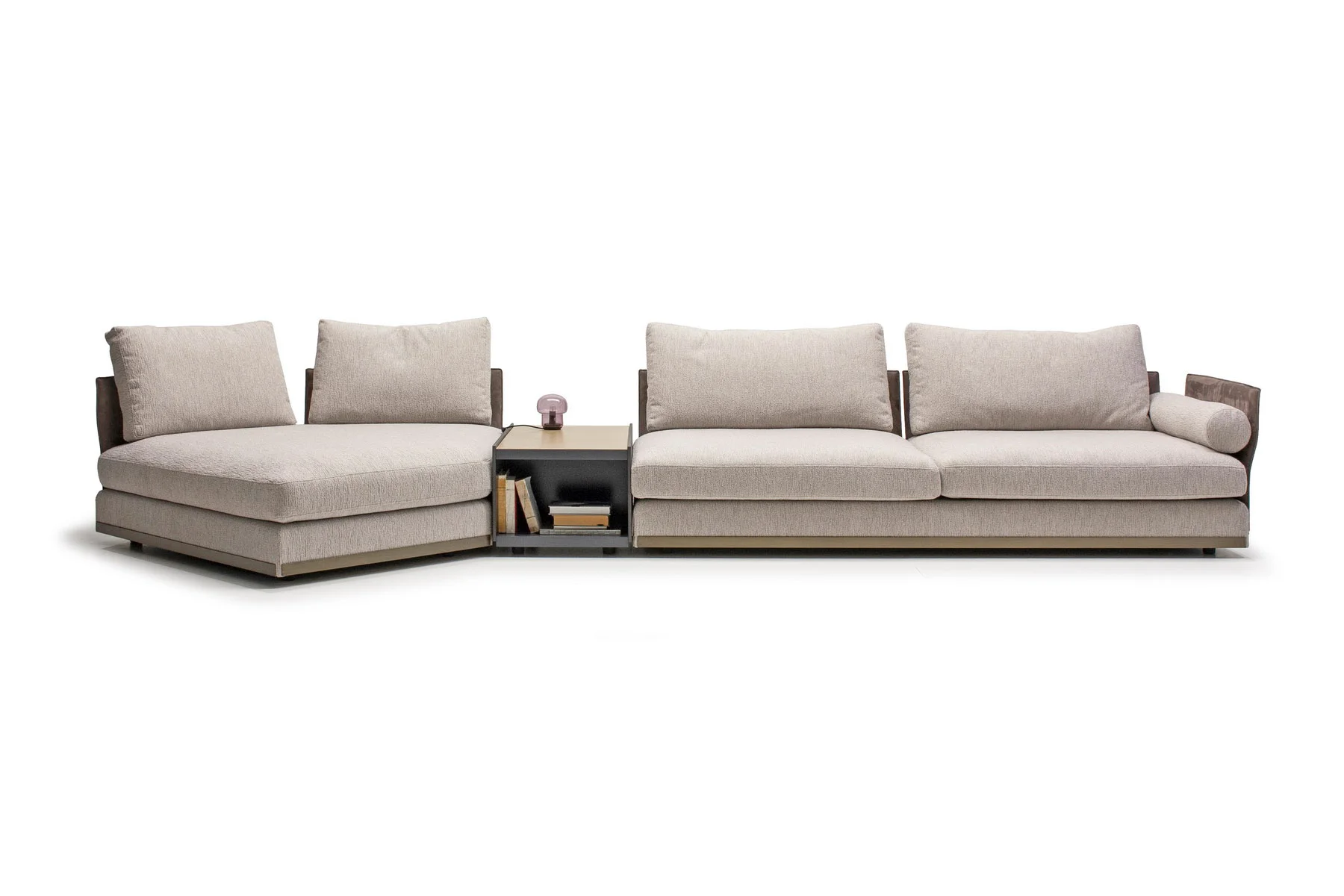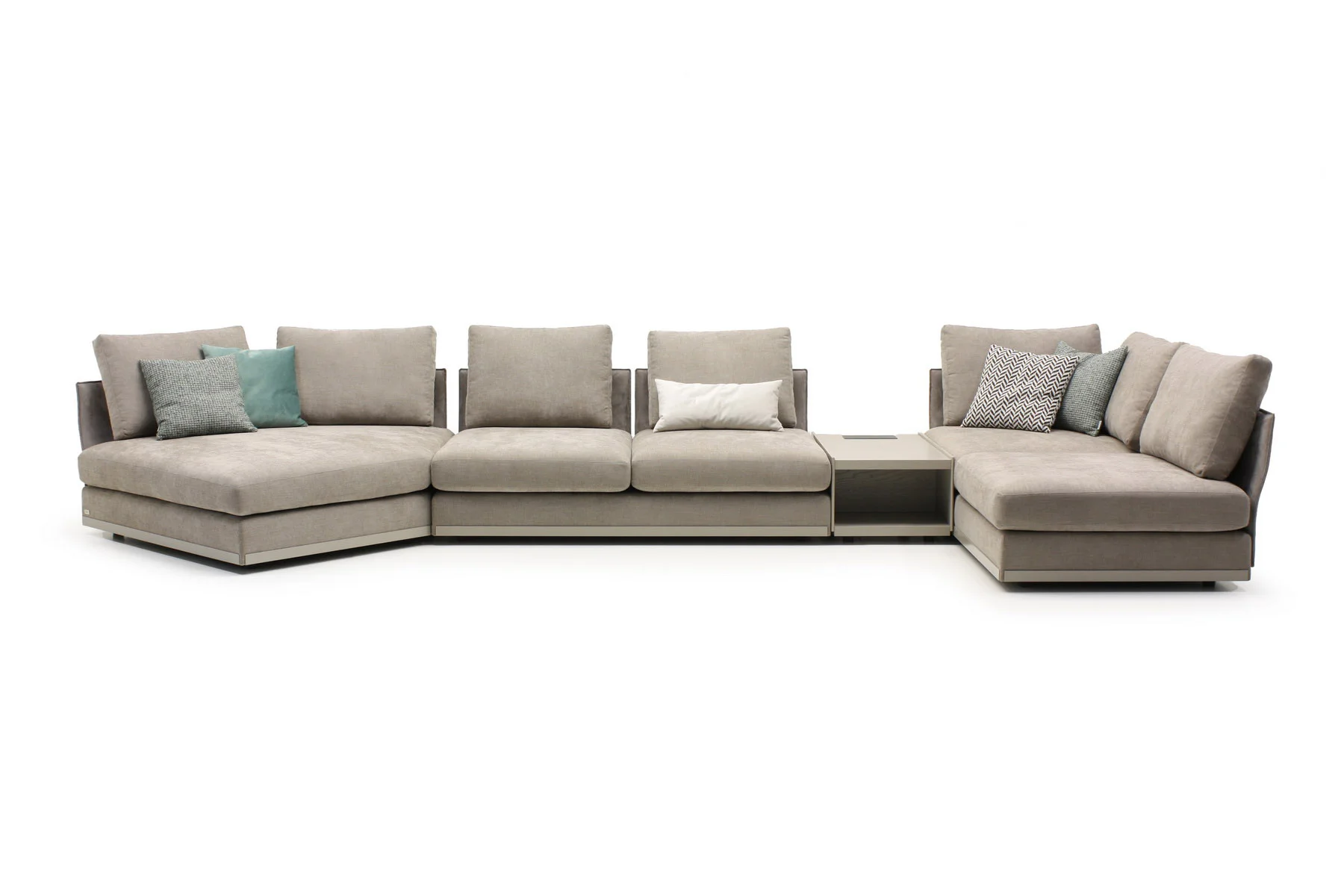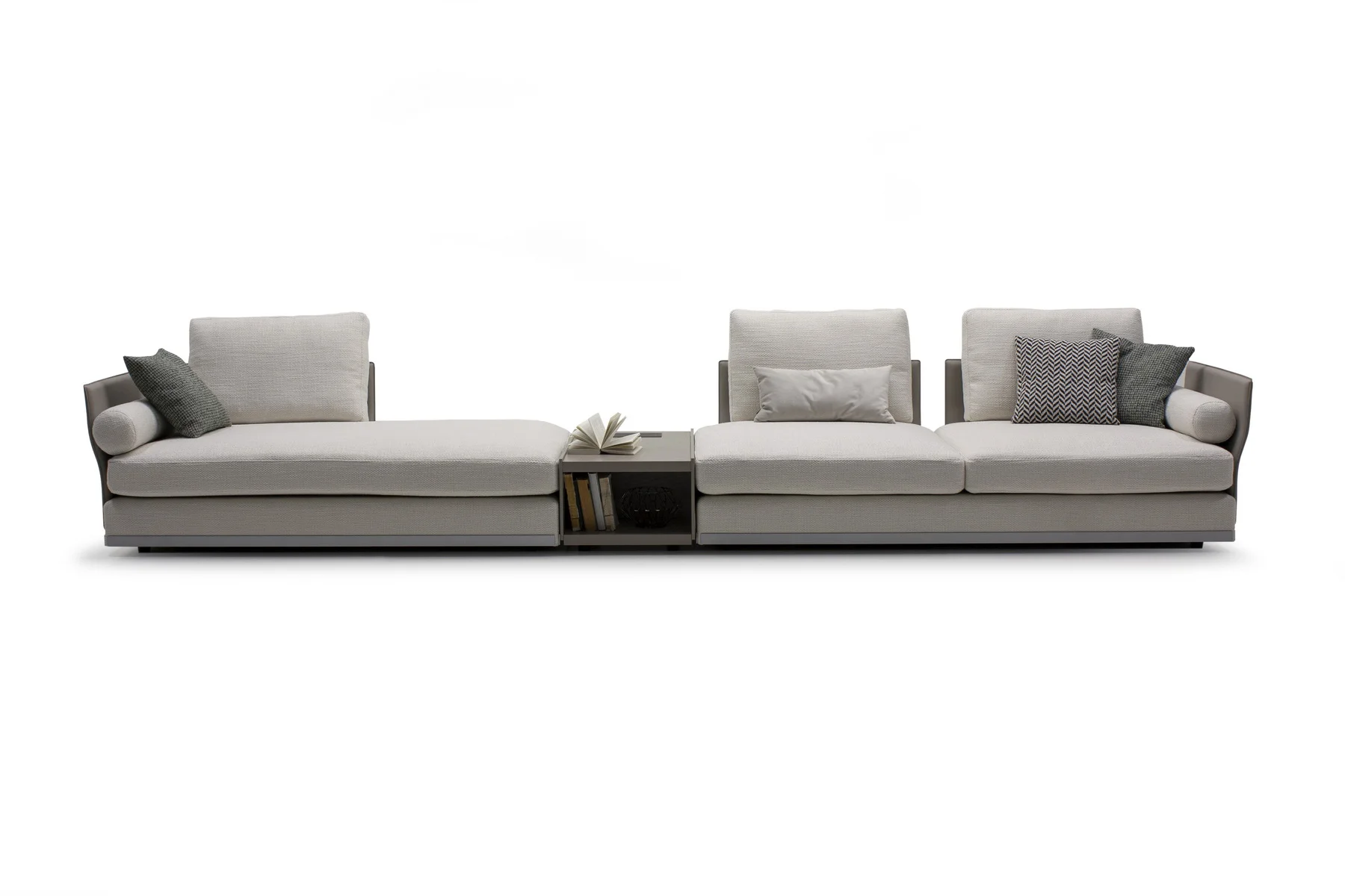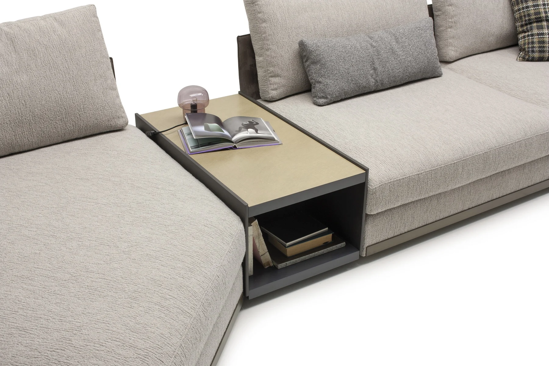 Модули дивана возможны в разных размерах, благодаря чему, Aston имеет много композиционных решений. По желанию его можно разнообразить модулем с полкой.