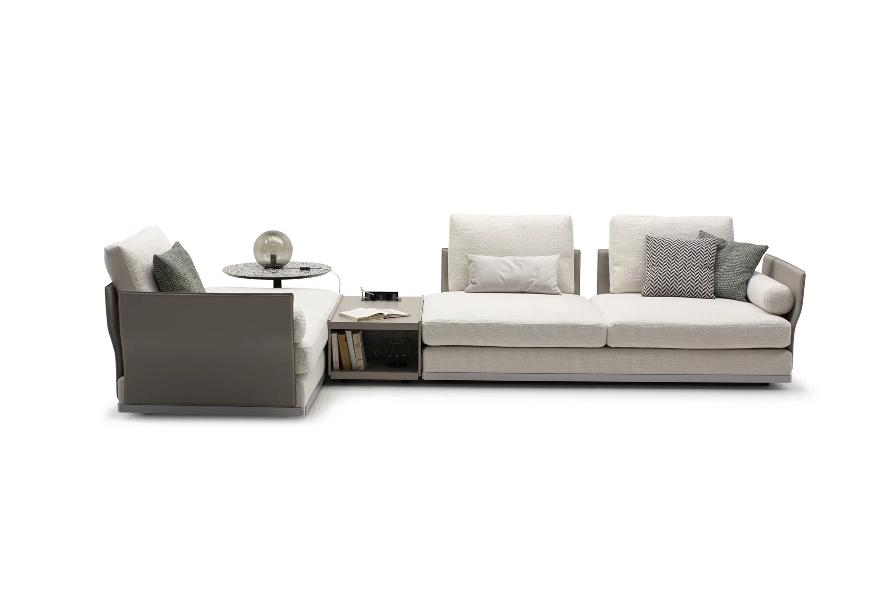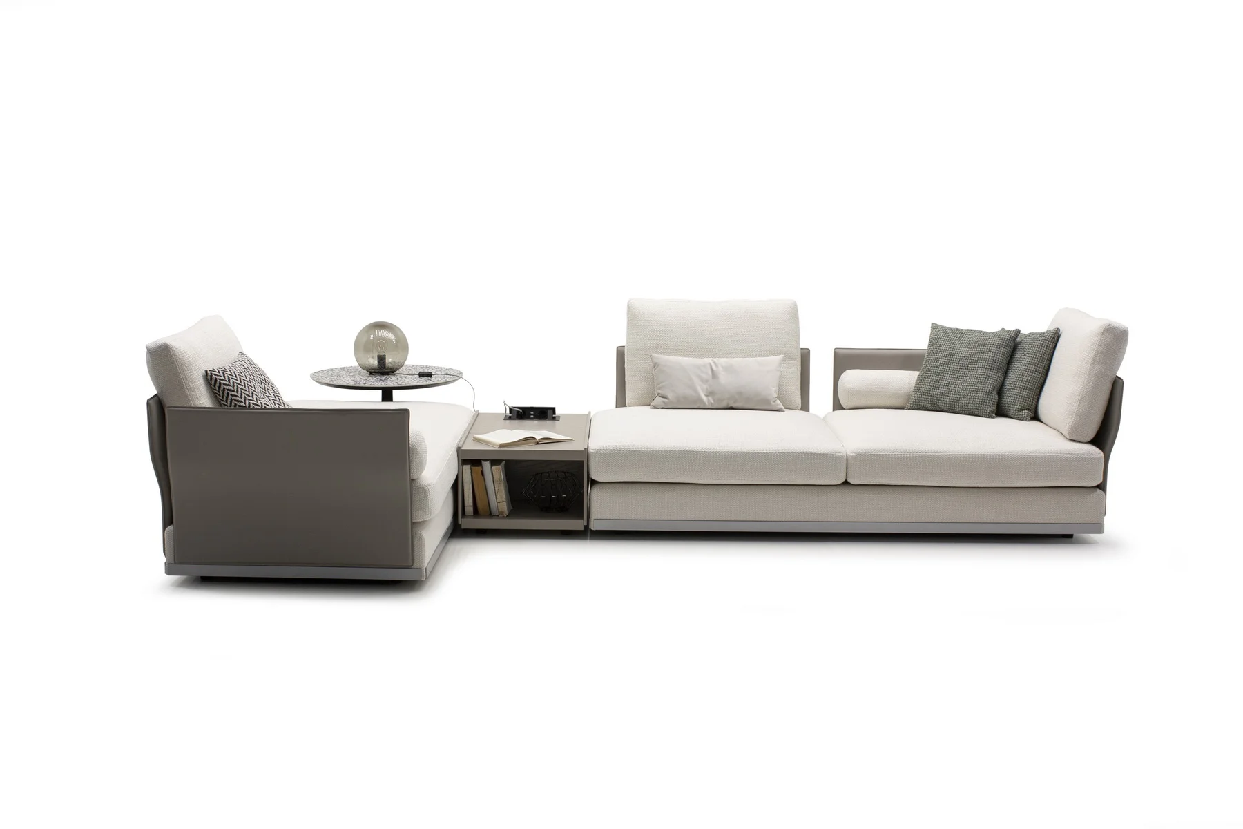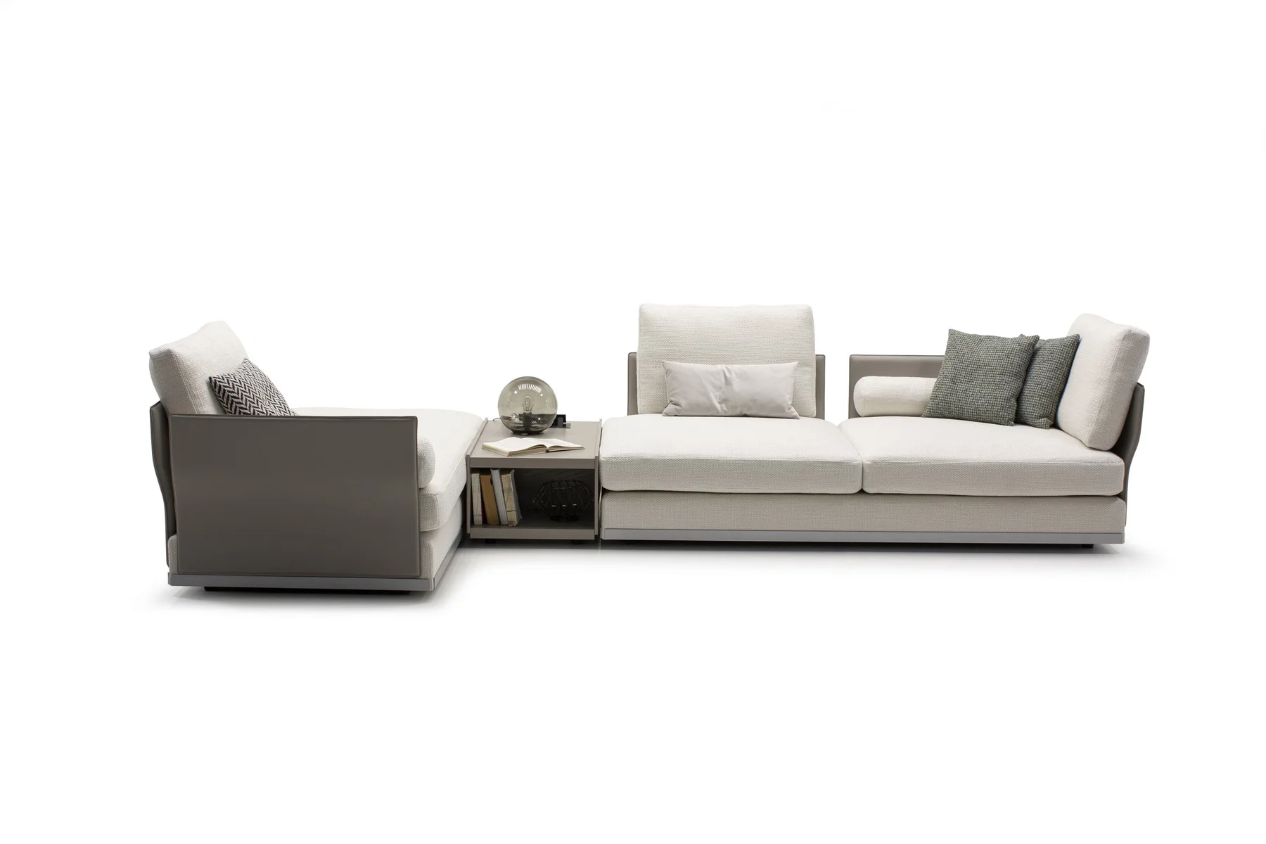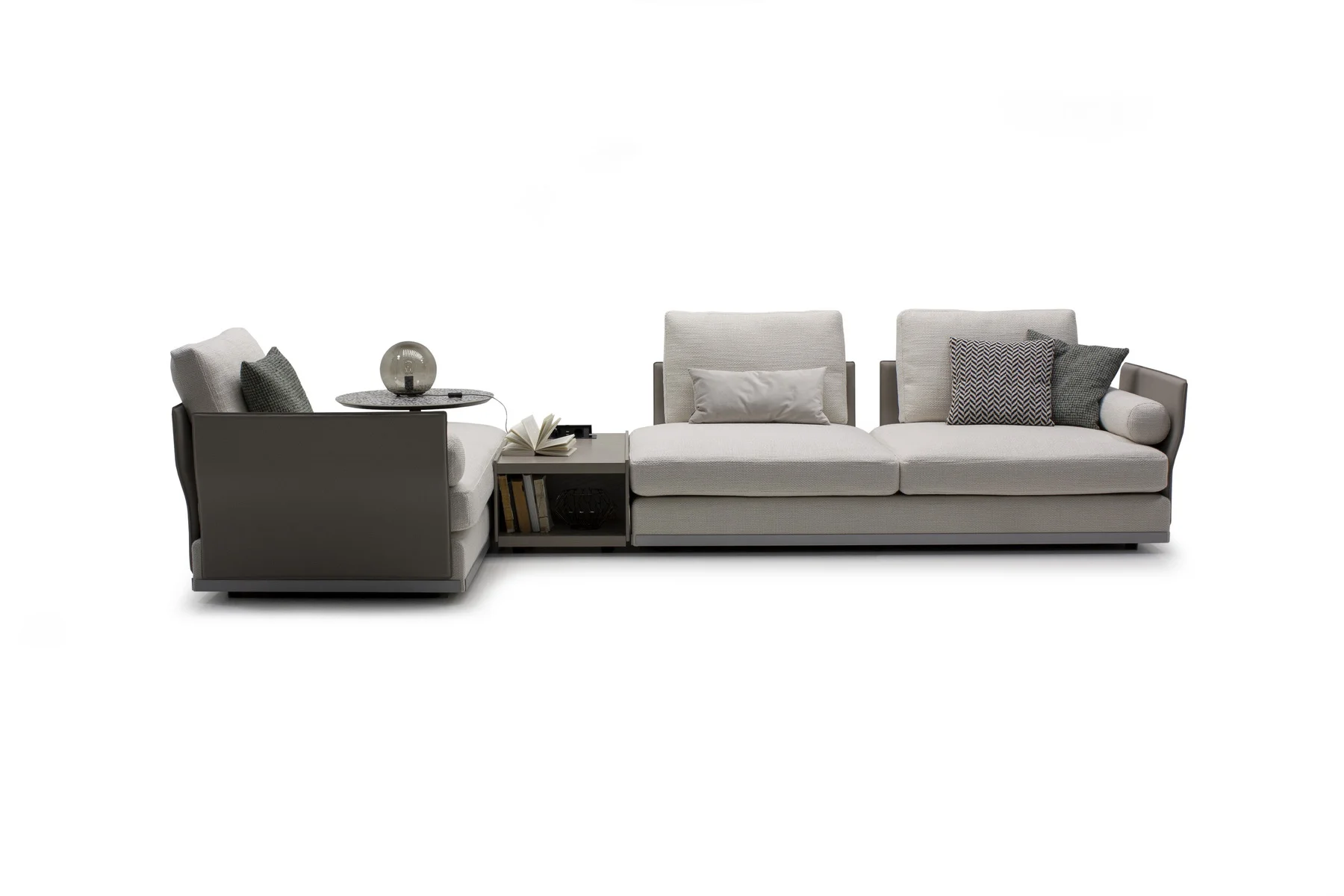 Модули дивана возможны в разных размерах, благодаря чему, Aston имеет много композиционных решений. По желанию его можно разнообразить модулем с полкой.