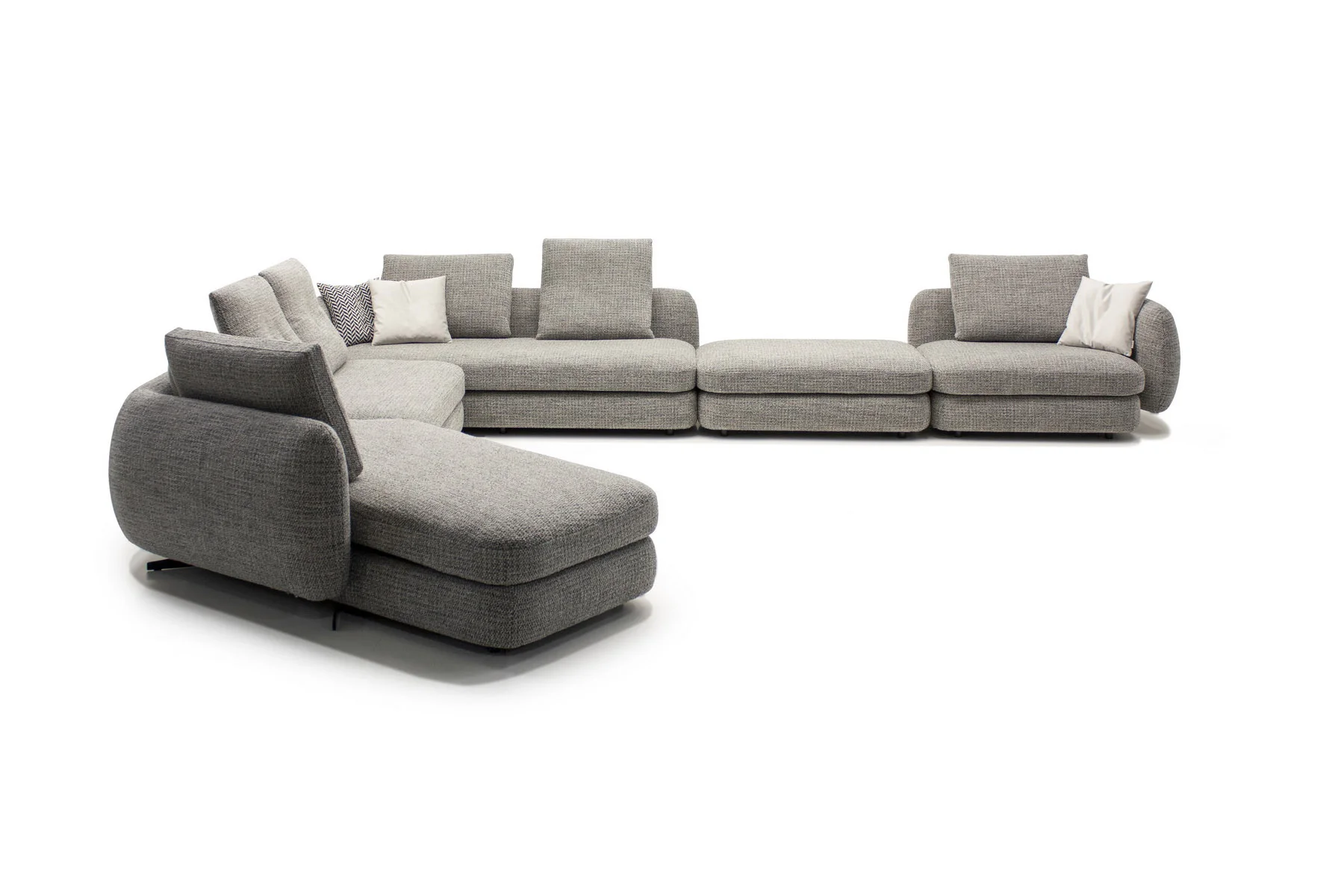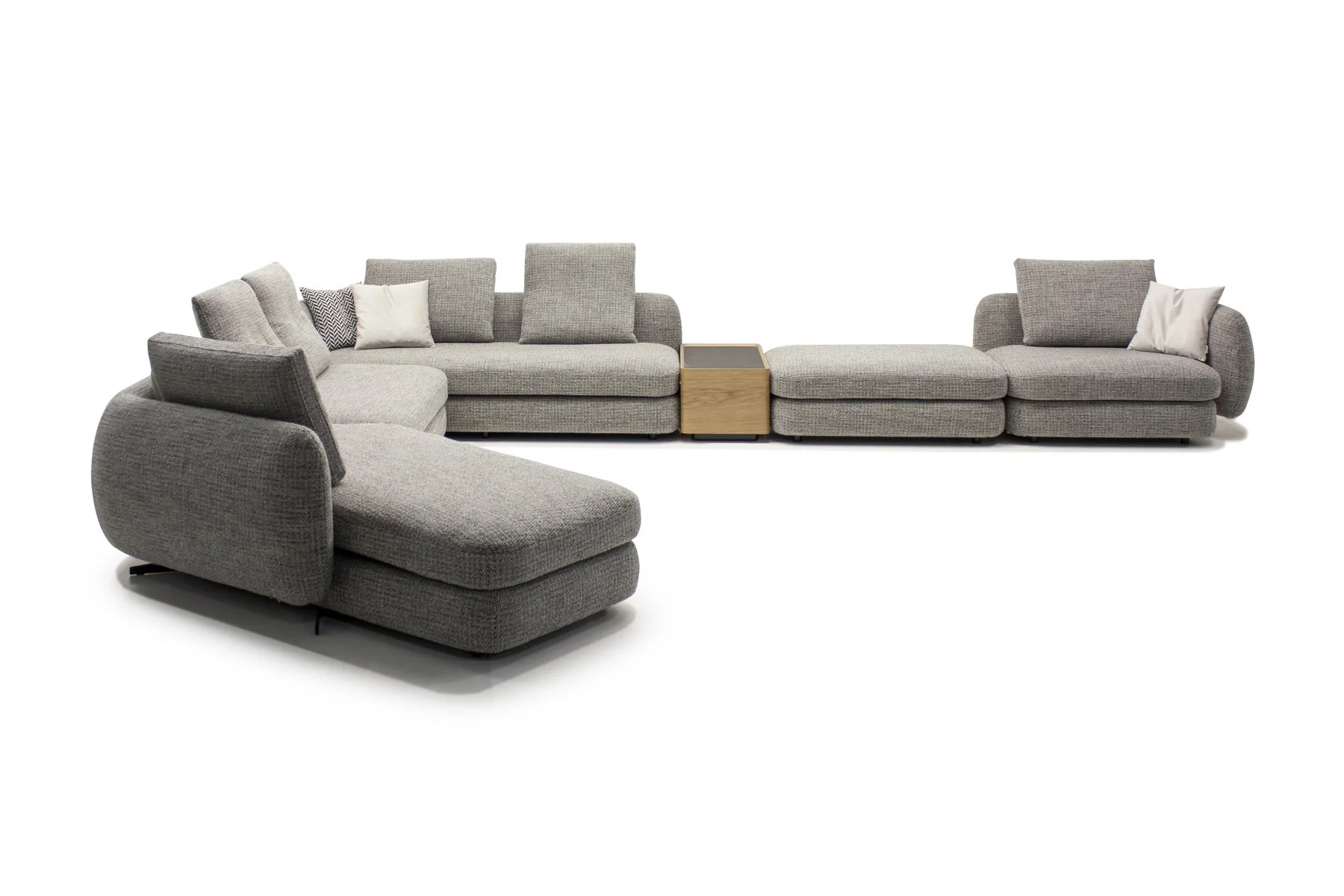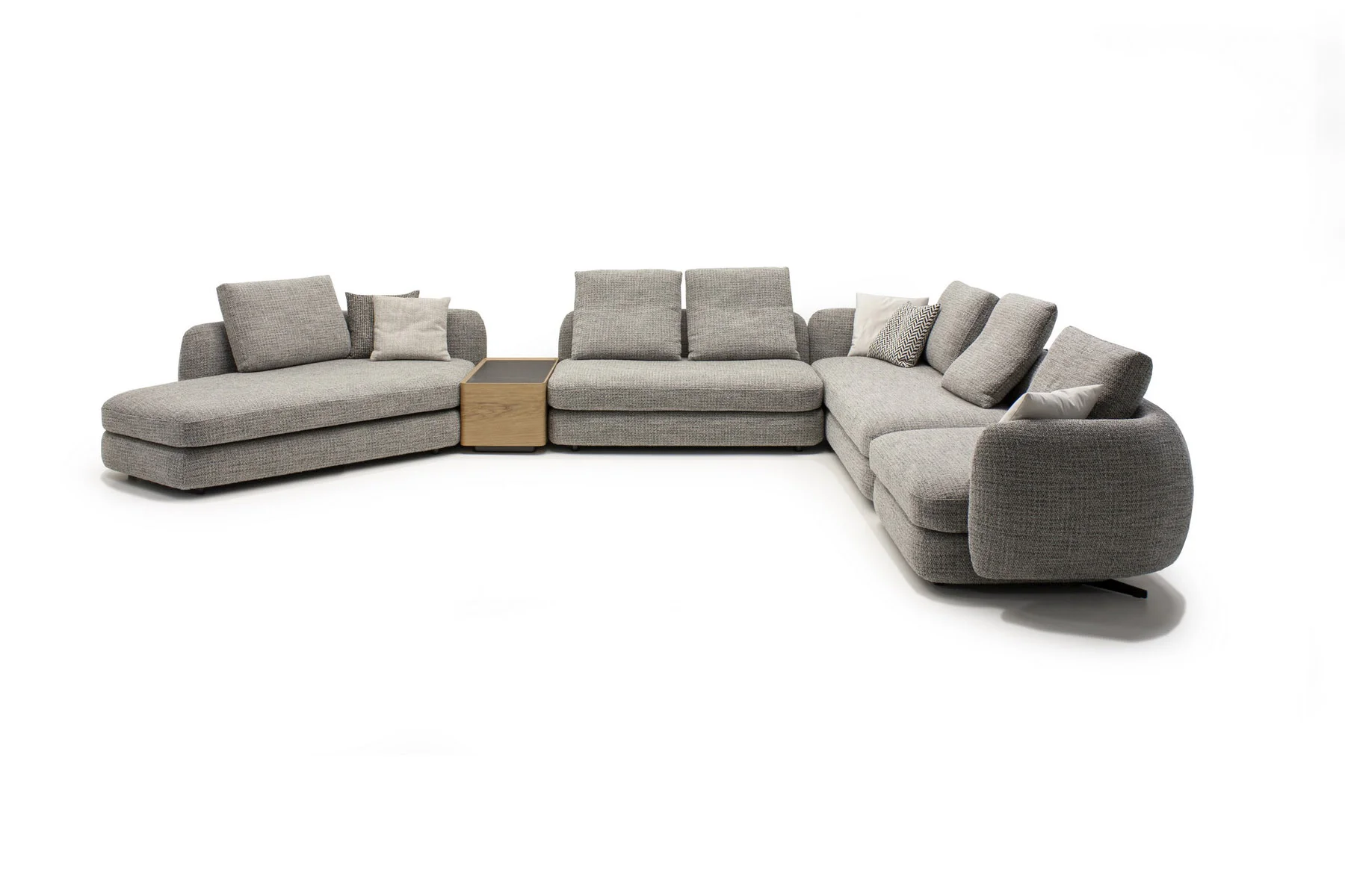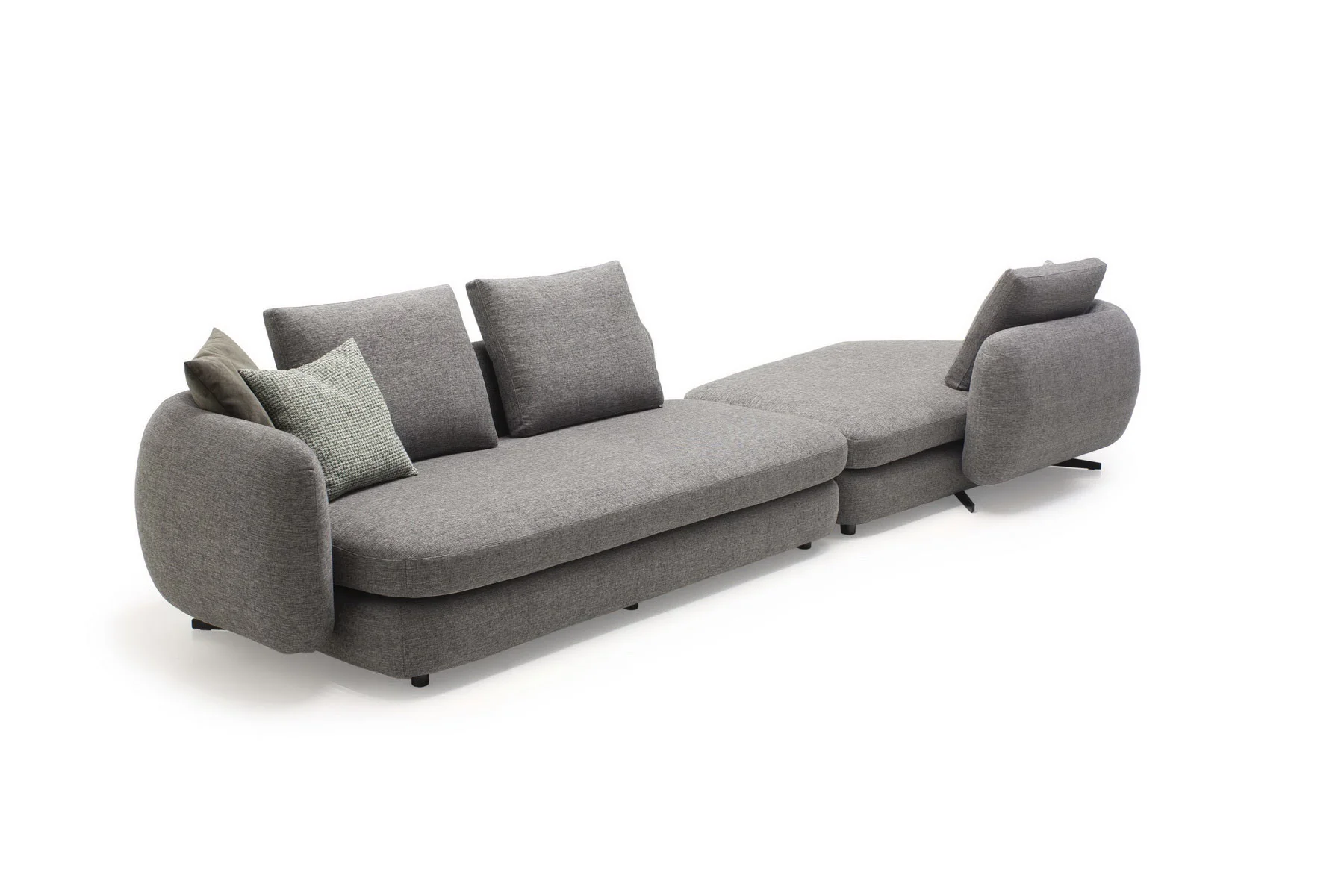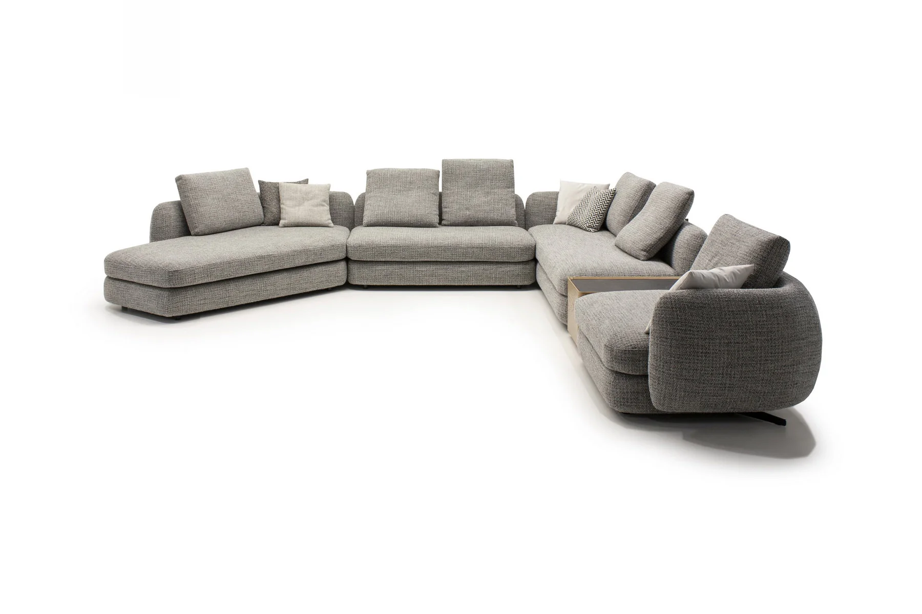 Форма сиденья сочетает трапеции и классические прямоугольники со скругленными деталями. Деликатная изысканность – это то, что позволяет ему принимать различные очертания и размеры, не утрачивая своей элегантности и функциональности. Модули дивана изысканных форм с разной глубиной очень комфортны и эргономичны.
