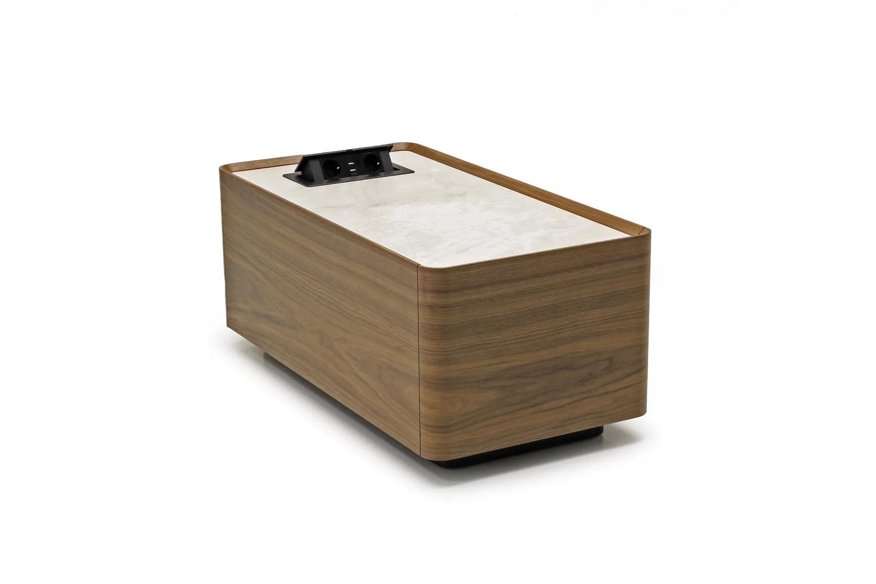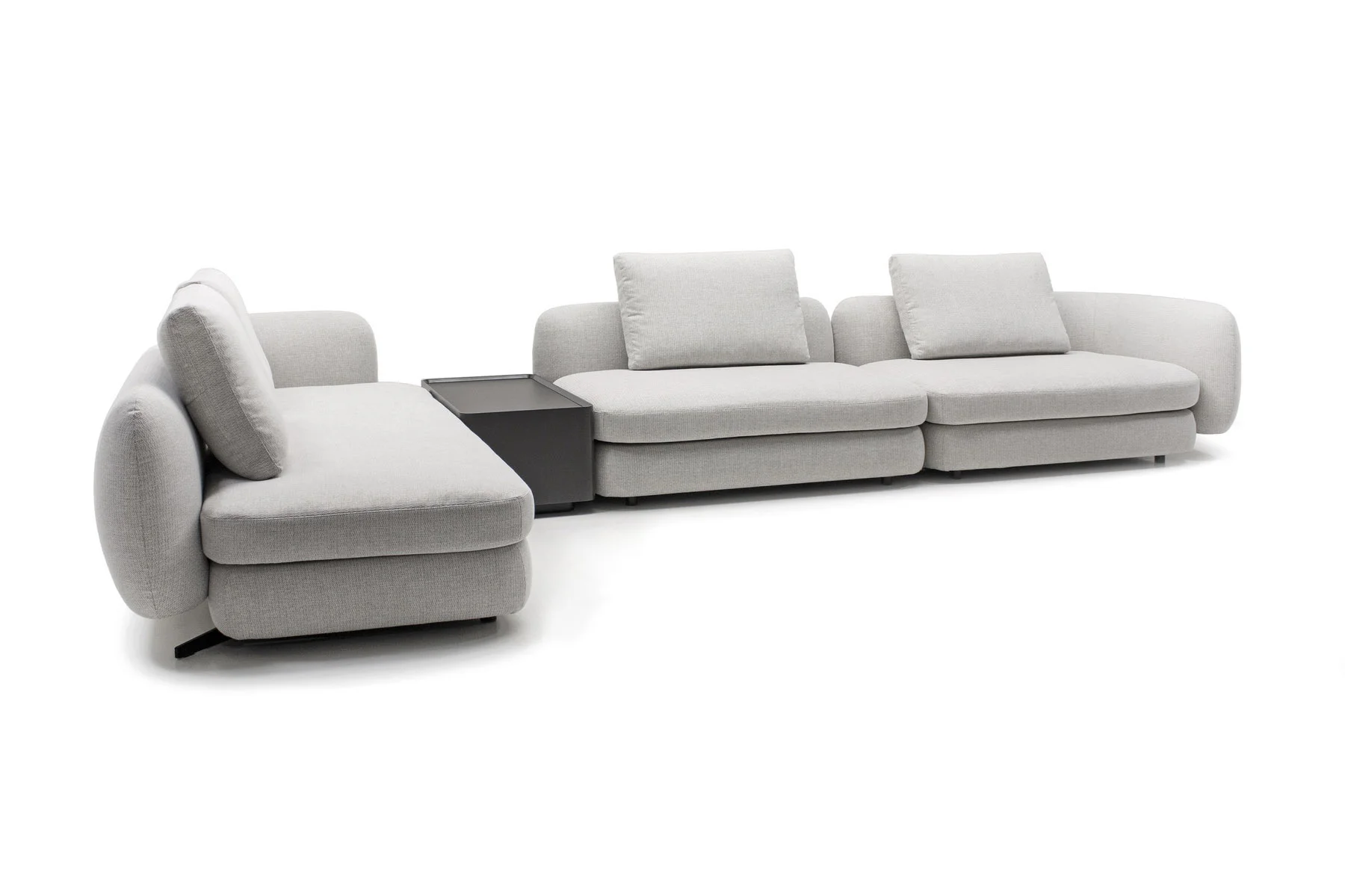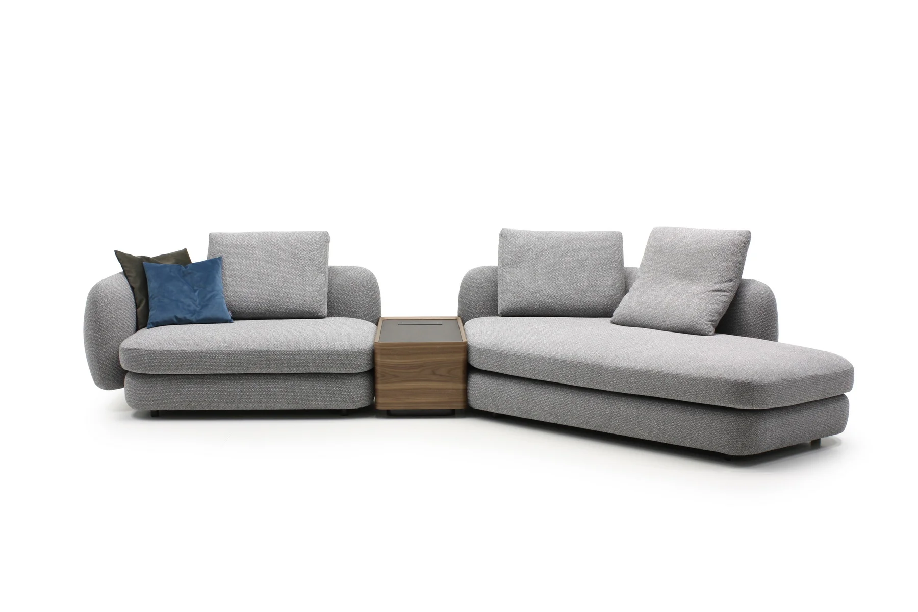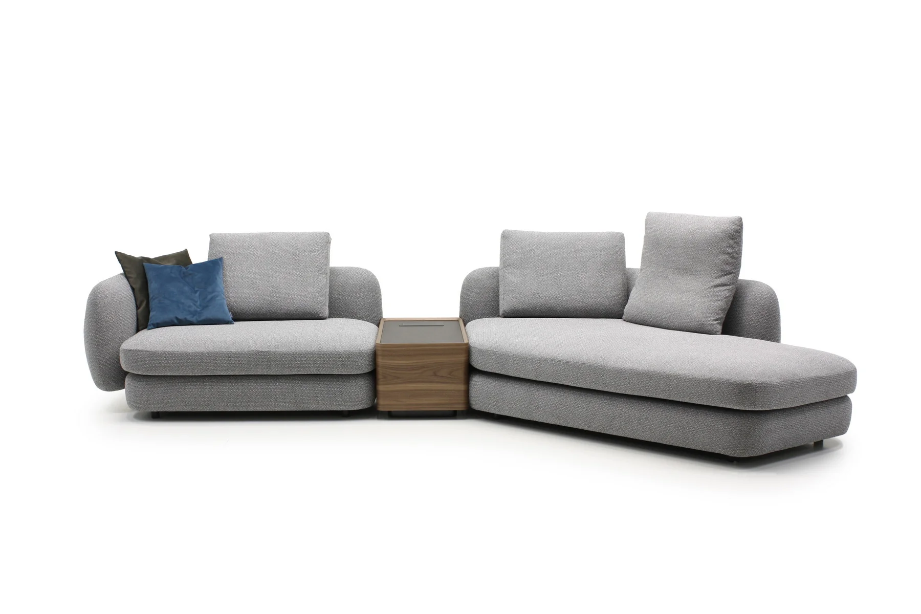 В середине или по бокам дивана может размещаться модуль с ящиком и встроенным блоком со стандартными розетками и USB-разъемами, что делает эту модель еще более функциональной.
